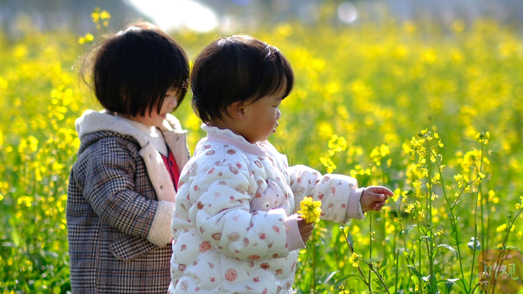 成都市郫都区早花油菜田内,小朋友凑近轻触金黄的油菜花。