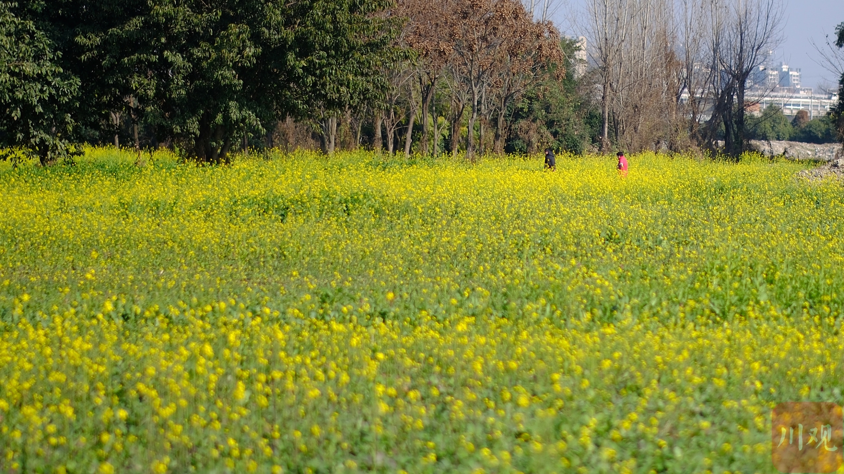 成都市郫都区早花油菜田内,市民漫步在冬日里的金黄花海间。