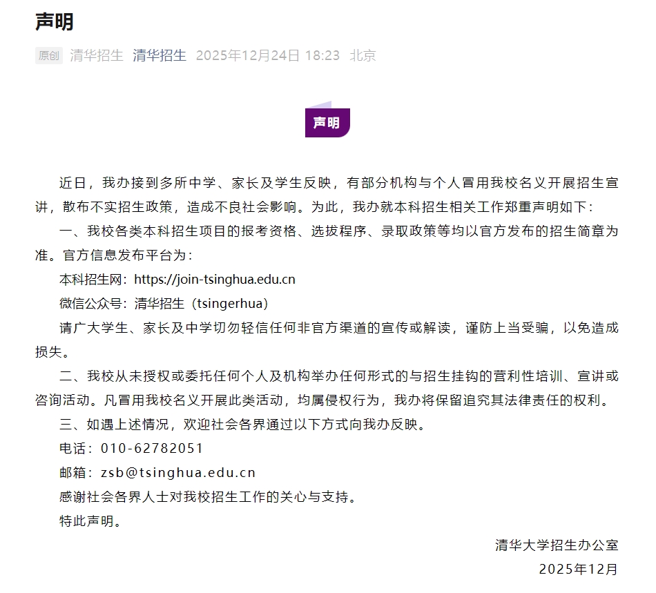 2025年12月24日,清华大学招生办发布郑重声明。强调清华大学各类本科招生项目的报考资格、选拔程序、录取政策等均以官方发布的招生简章为准,具体需关注清华招生微信公众号或本科招生网。清华大学从未授权或委托任何个人及机构举办任何形式的与招生挂钩的营利性培训、宣讲或咨询活动。