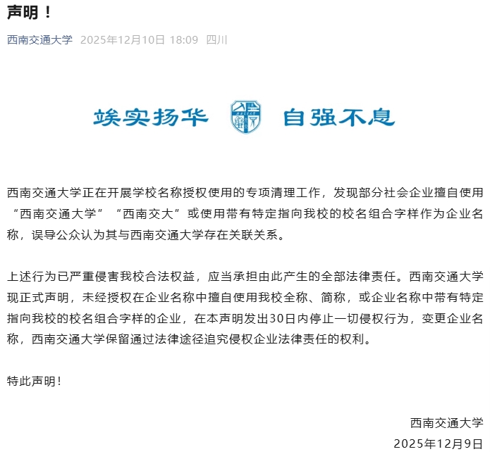2025年12月9日,西南交通大学发布声明称,该校正在开展学校名称授权使用的专项清理工作,发现部分社会企业擅自使用“西南交通大学”“西南交大”或使用带有特定指向该校的校名组合字样作为企业名称,误导公众认为其与西南交通大学存在关联关系。学校称,上述行为已严重侵害该校合法权益,应当承担由此产生的全部法律责任。