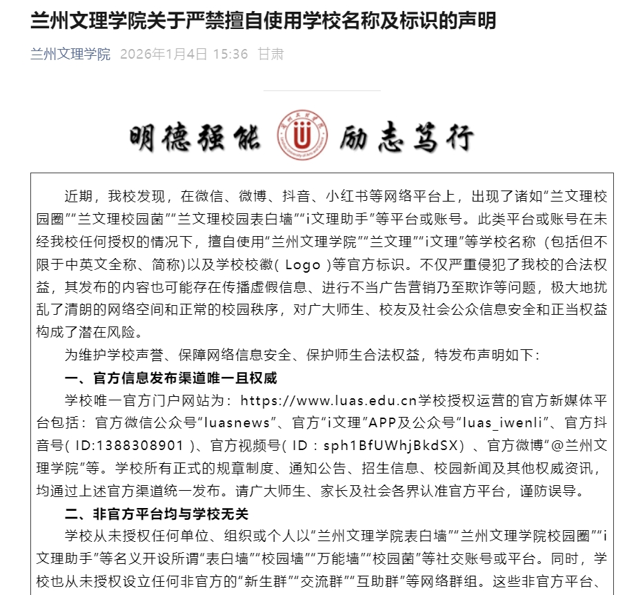 2026年1月4日,兰州文理学院发布声明称,近期,该校发现,在微信、微博、抖音、小红书等网络平台上,出现了诸如“兰文理校园圈”“兰文理校园菌”“兰文理校园表白墙”“i文理助手”等平台或账号。此类平台或账号在未经该校任何授权的情况下,擅自使用“兰州文理学院”“兰文理”“i文理”等学校名称(包括但不限于中英文全称、简称)以及学校校徽(Logo)等官方标识。不仅严重侵犯了该校的合法权益,其发布的内容也可能存在传播虚假信息、进行不当广告营销乃至欺诈等问题,极大地扰乱了清朗的网络空间和正常的校园秩序,对广大师生、校友及社会公众信息安全和正当权益构成了潜在风险。