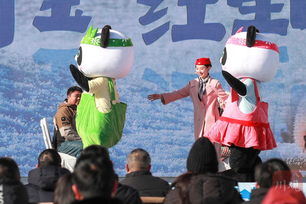 雅安以情景剧的形式,和城市吉祥物熊猫“雅雅”“安安”一起推介冰雪旅游亮点