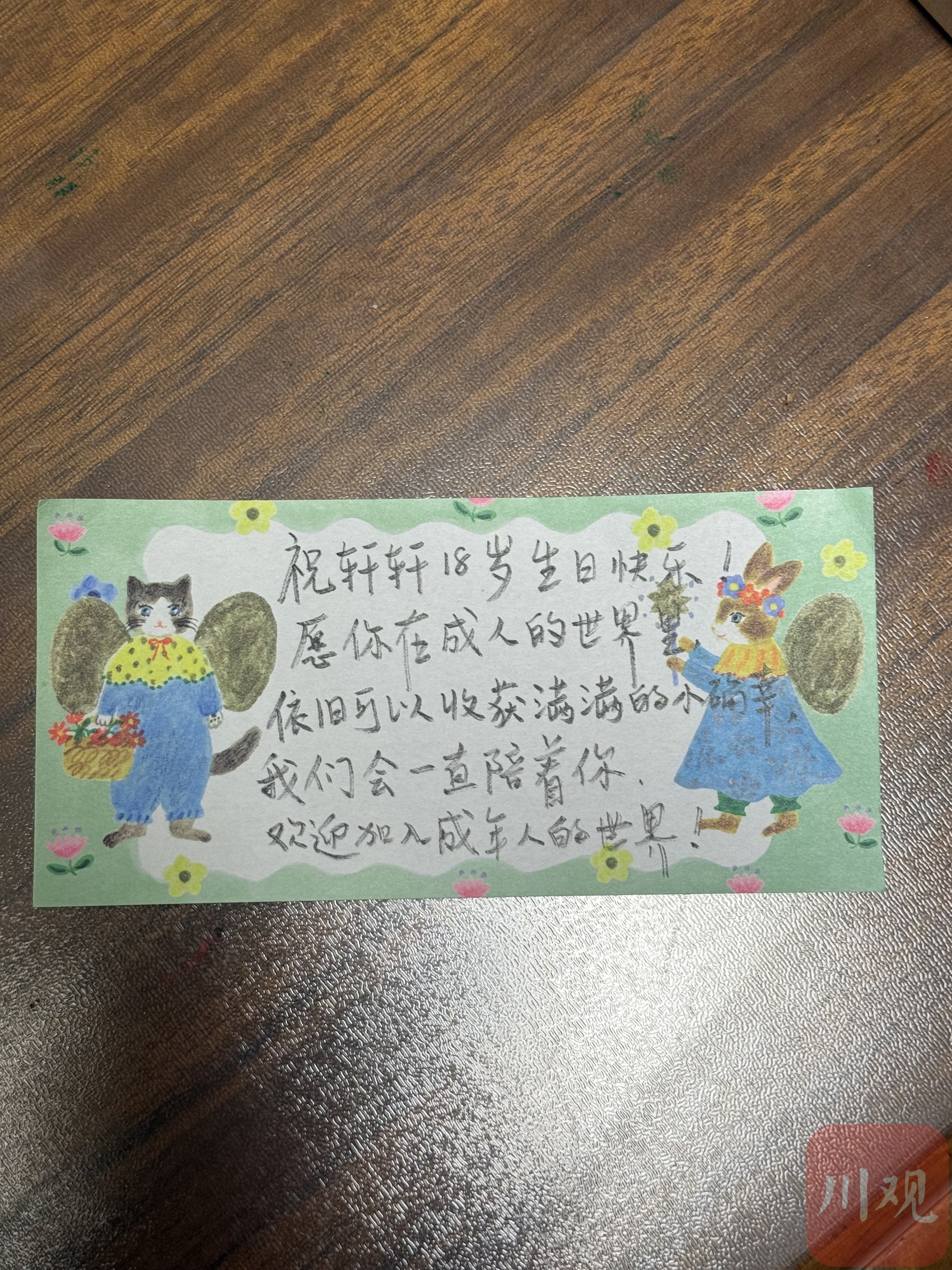 还有远方的心意。广州网友寄来了蛋糕和贺卡,青岛星空智程给轩轩定制了一套合身西服。贺卡上字迹工整地写着:“愿你在成人的世界里,依旧可以收获满满的小确幸。”“我们会一直陪着你,欢迎加入成年人的世界。”当轩轩穿上挺括的西服,干强发现,过去和他一样高的男孩,已高出他一个头。