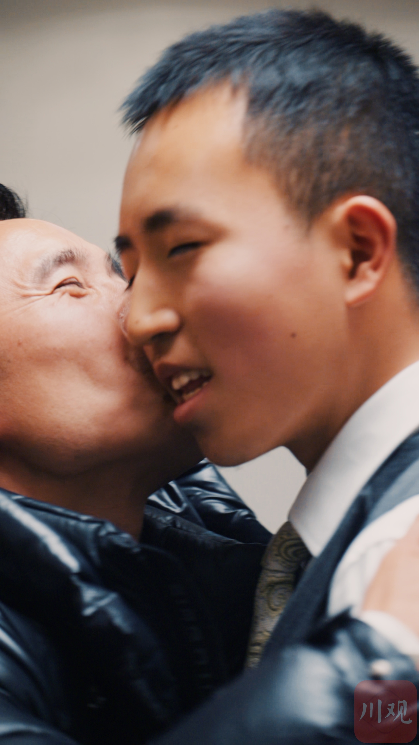 换完西装,干强送给高出自己一个头的儿子一个吻。
