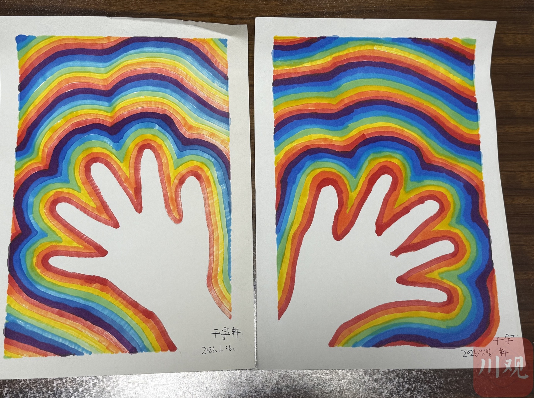 画上是手的轮廓,由内向外,一圈一圈,涂满规整而绚烂的色彩——红、黄、蓝、绿、紫,五彩斑斓向外蔓延。那是他自己的手拓印、描绘的。