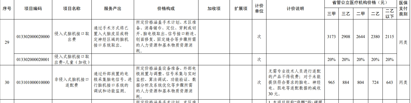 根据国家医保局相关医疗服务价格项目立项指南要求,近日,四川省医保局印发相关通知,整合了神经系统医疗服务价格项目82项,并明确医保支付类别。82项神经系统医疗服务价格项目中,包含了四川省脑机接口医疗服务项目及价格。此政府指导价为最高限价,今年4月30日起执行。