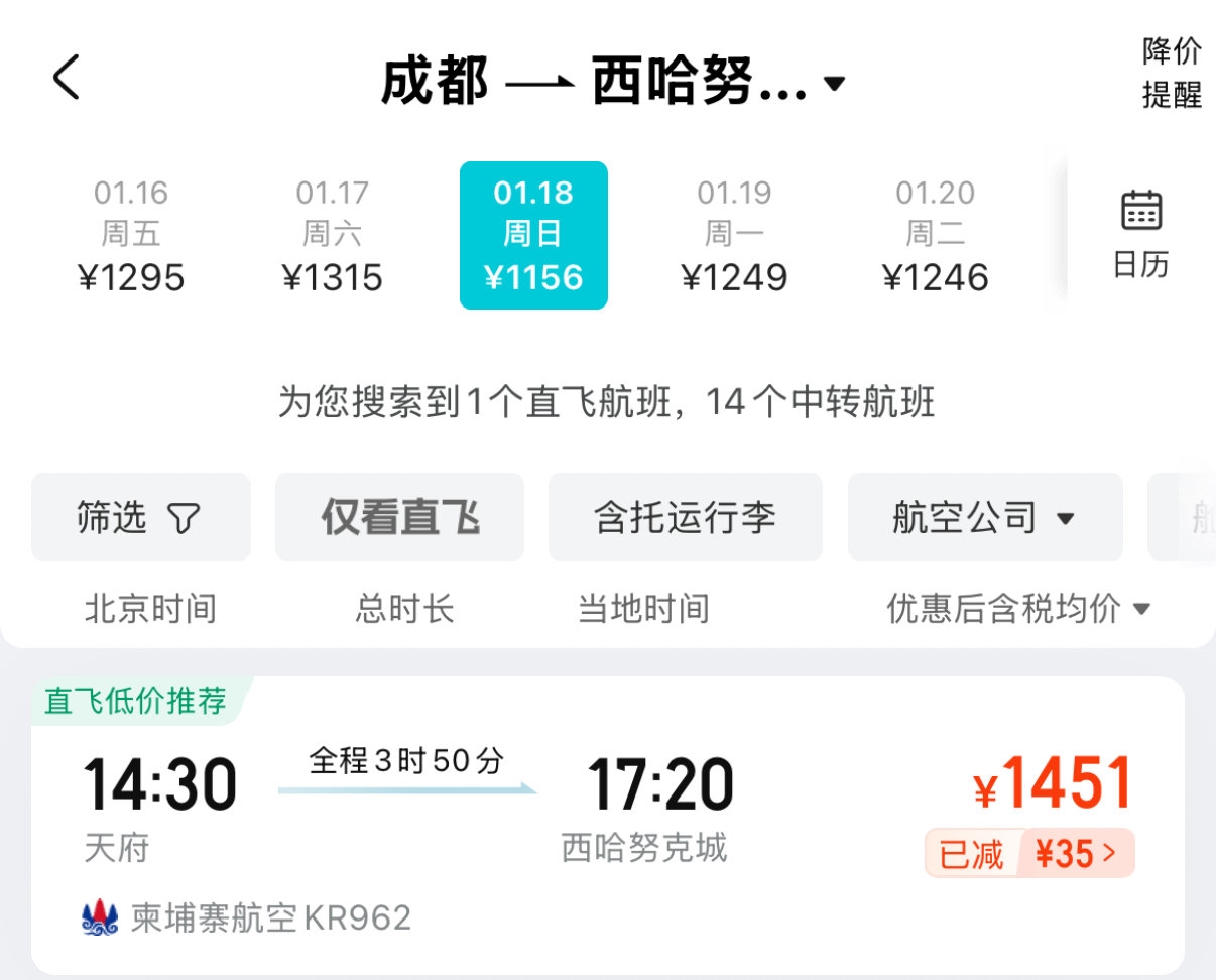 柬埔寨航空原定于1月7日开通成都直飞西哈努克航线。记者查询发现,目前已延期至1月18日开通,每周三、五、七执飞,两地飞行时间压缩至3小时50分钟,较中转行程节省至少6小时,填补成都与柬埔寨南部旅游枢纽的直飞空白。