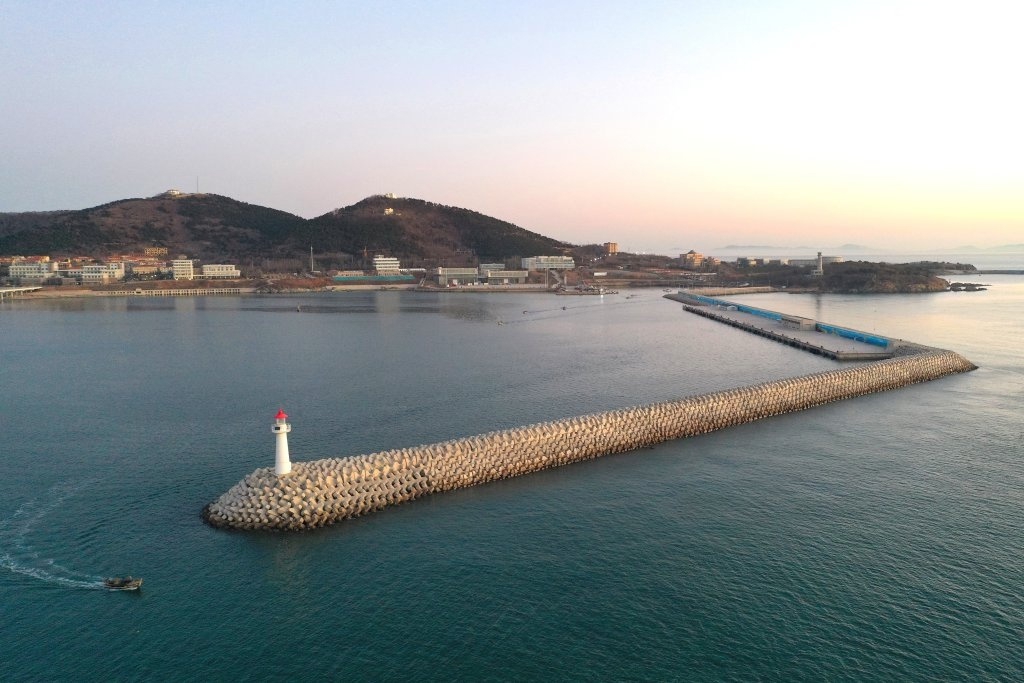 1月8日拍摄的位于山东省青岛市鳌山湾的“梦想”号大洋钻探船北方母港(无人机照片)。