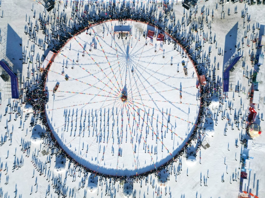 1月8日,在吉林省松原市,人们参加吉林·查干湖第24届冰雪渔猎文化旅游节开幕式(无人机照片)。