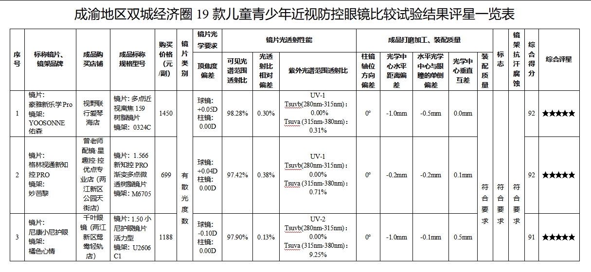 成渝地区双城经济圈市场儿童青少年近视防控眼镜品质状况如何?近期,四川省保护消费者权益委员会联合重庆市消费者权益保护委员会,对19款儿童青少年近视防控眼镜开展了比较试验,并于1月8日联合发布《19款儿童青少年近视防控眼镜比较试验分析报告》。报告显示,样品的综合表现与价格未必有直接关系。