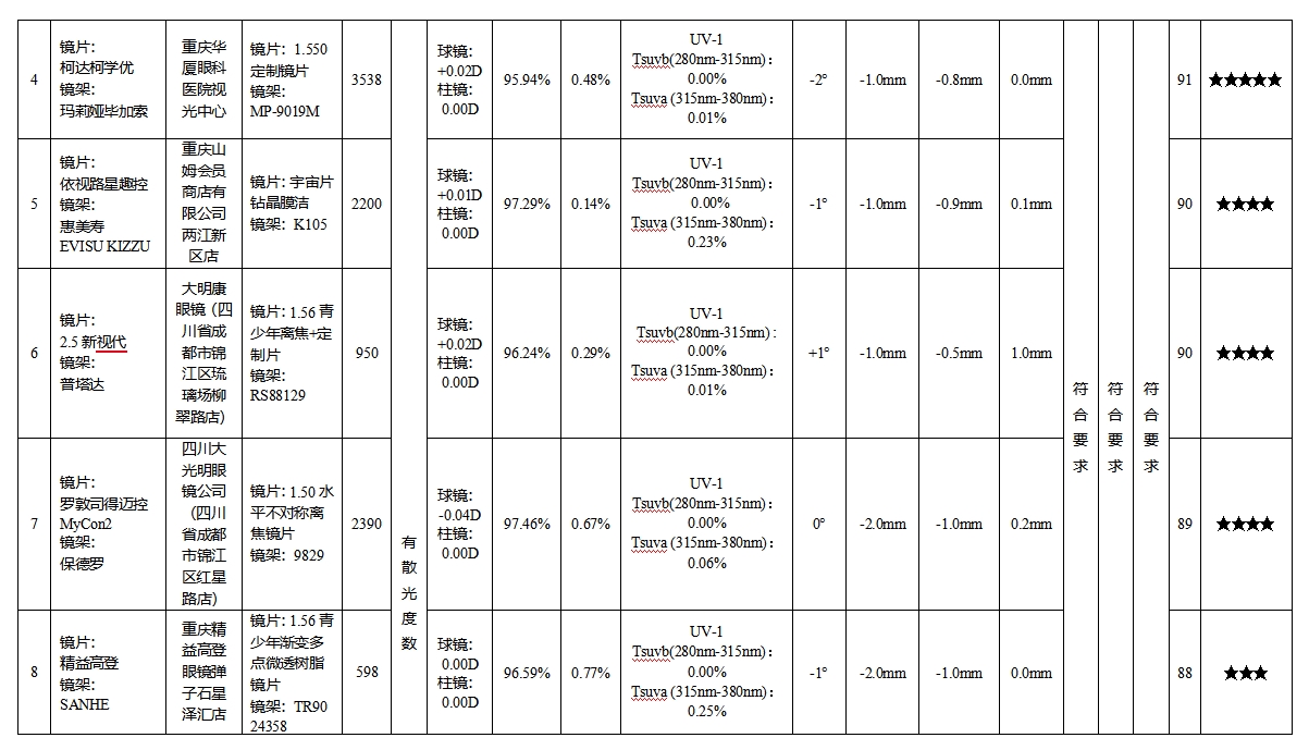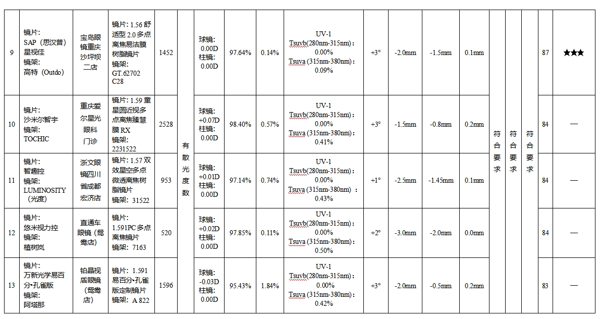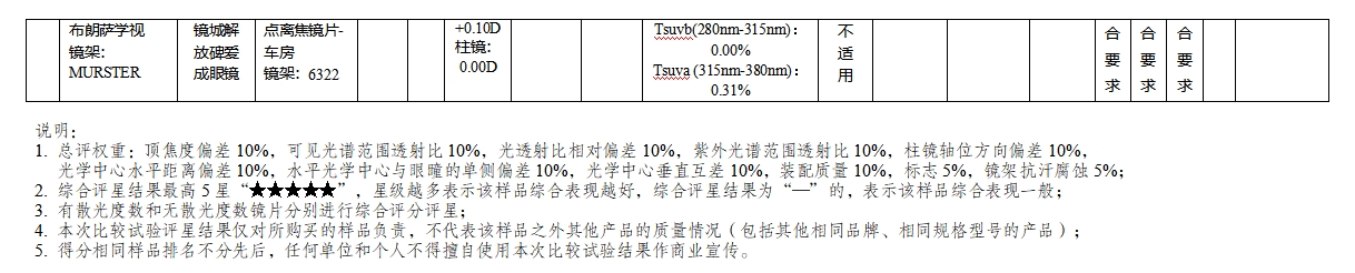 结果显示,14款具有散光度数的防控眼镜样品中,4款样品综合表现卓越获评五星;3款样品综合表现优秀获评四星;2款样品综合表现良好获评三星;5款样品综合表现一般,未获评星。其余5款无散光度数的防控眼镜样品中,1款样品综合表现卓越获评五星;1款样品综合表现优秀获评四星;2款样品综合表现良好获评三星,1款样品综合表现一般,未获评星。