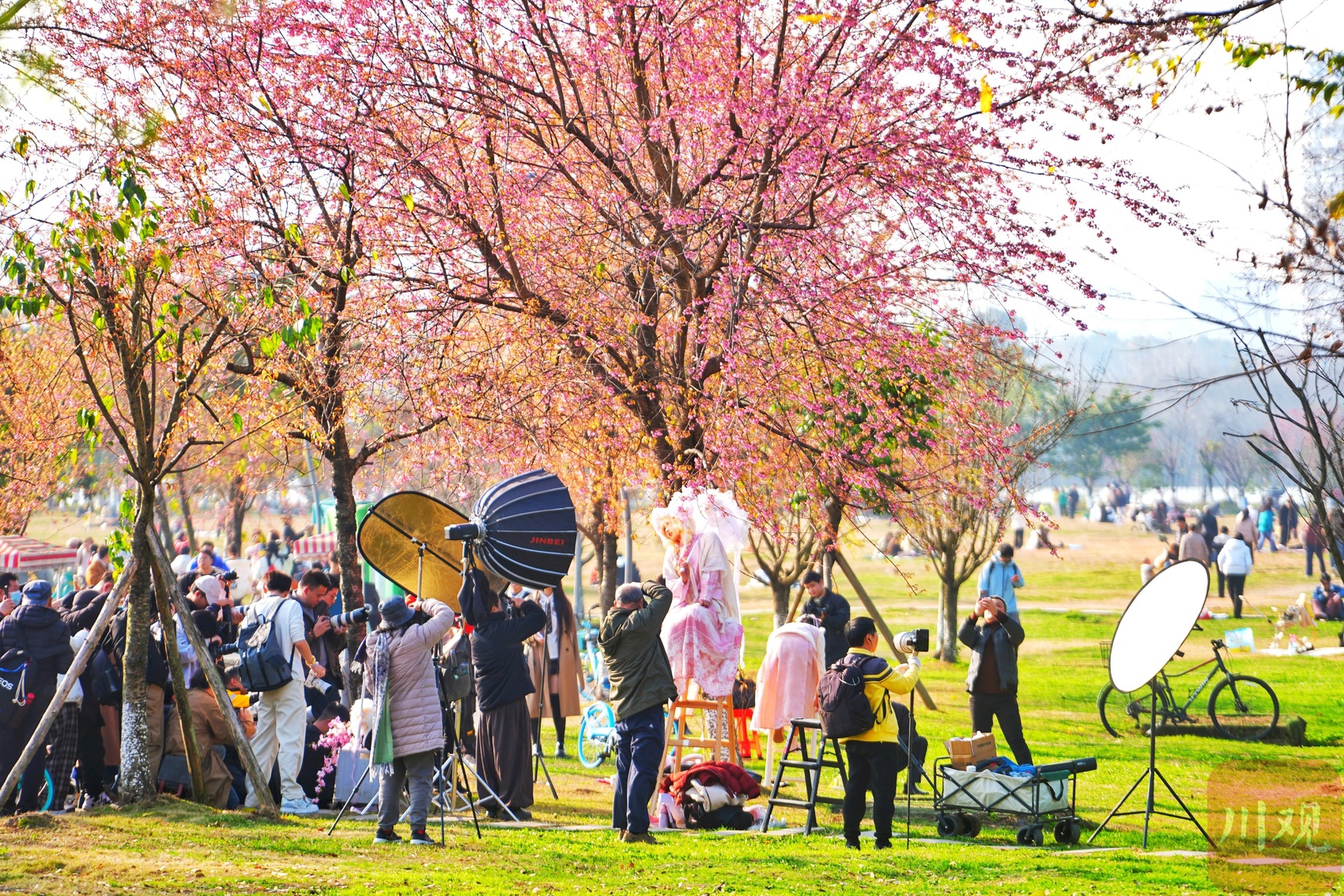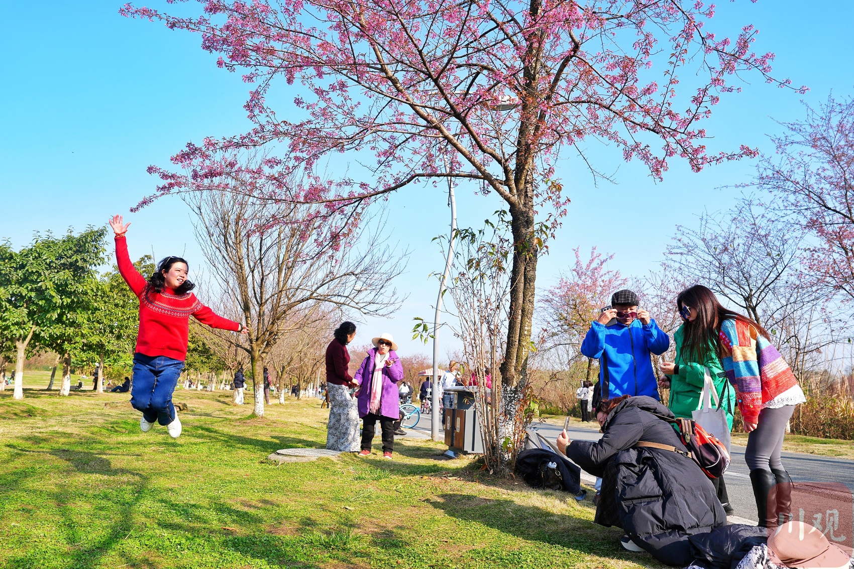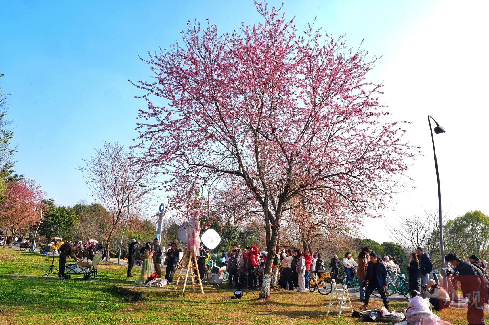 “今年樱花开得真早,元旦后就有零星花朵,现在已经成片盛放了!”刚出地铁4号线成都大学站B口,市民李女士便迫不及待向公园方向走去。午后,该地铁站出口人流已络绎不绝,公园周边停车场早已一位难求,平日里周末才有的热闹景象,在工作日提前上演。