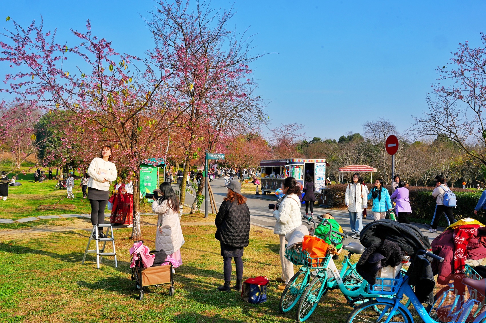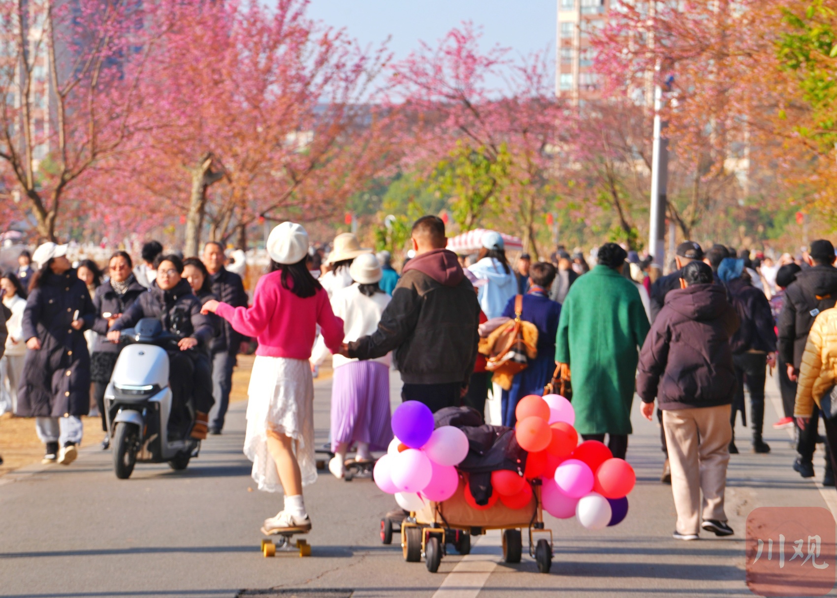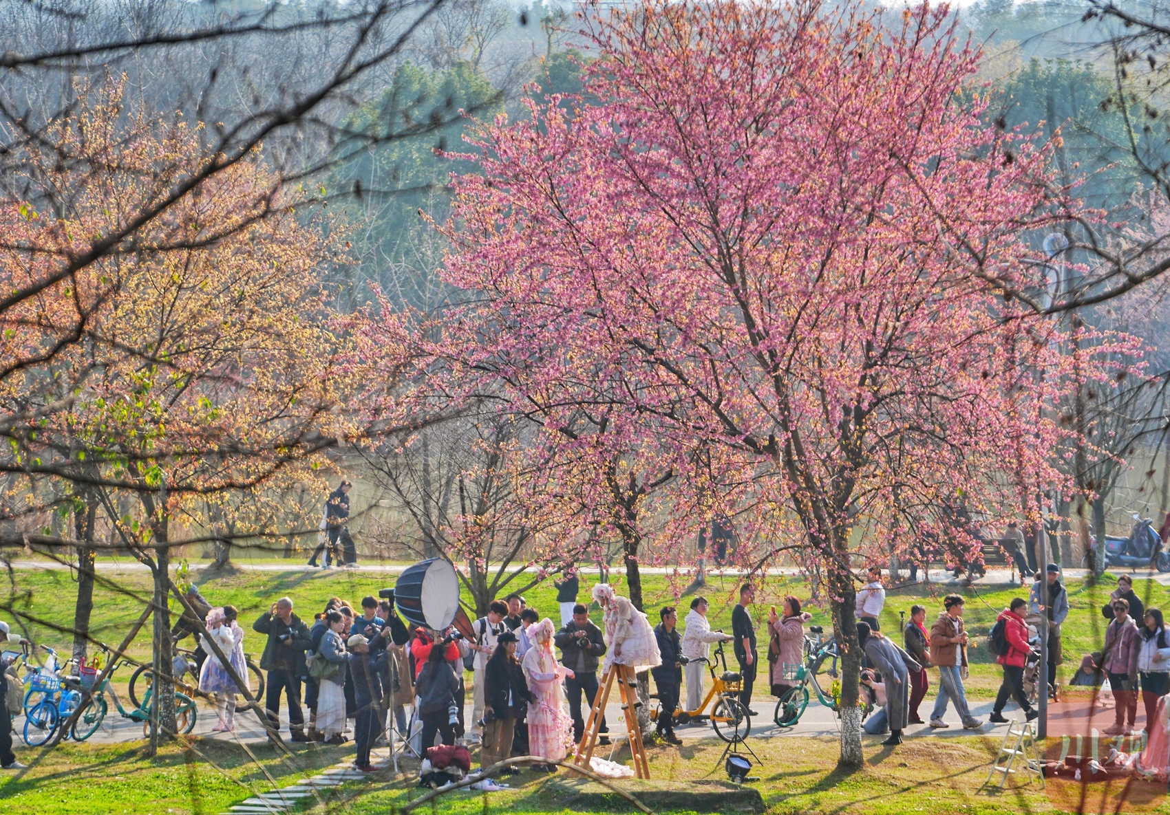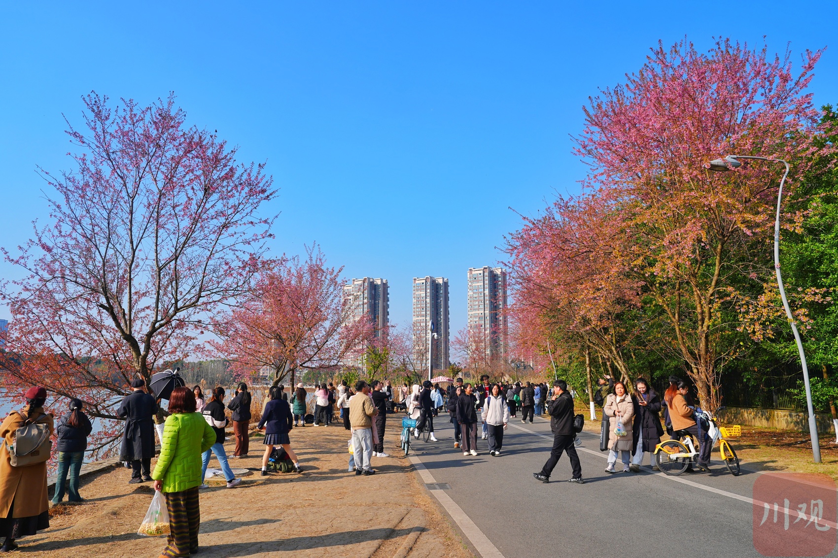“今年樱花开得真早,元旦后就有零星花朵,现在已经成片盛放了!”刚出地铁4号线成都大学站B口,市民李女士便迫不及待向公园方向走去。午后,该地铁站出口人流已络绎不绝,公园周边停车场早已一位难求,平日里周末才有的热闹景象,在工作日提前上演。