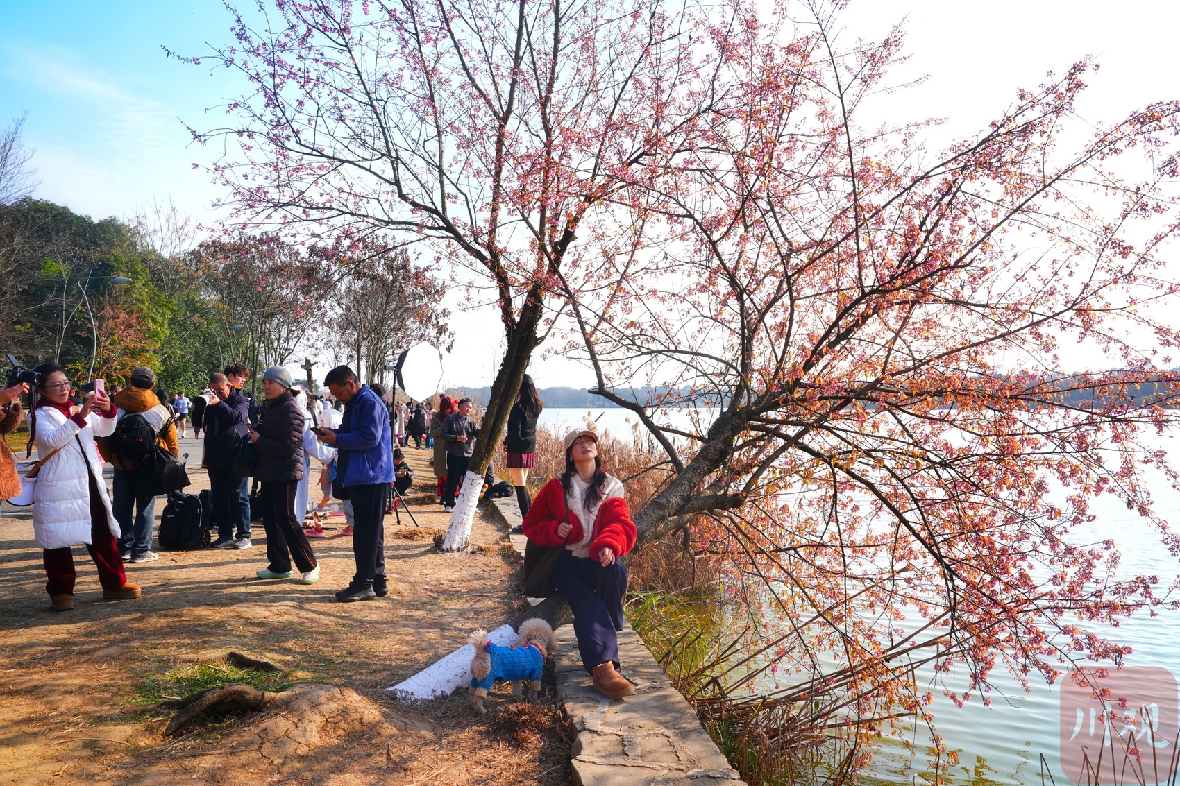 市民在湖边的樱花树下拍照。