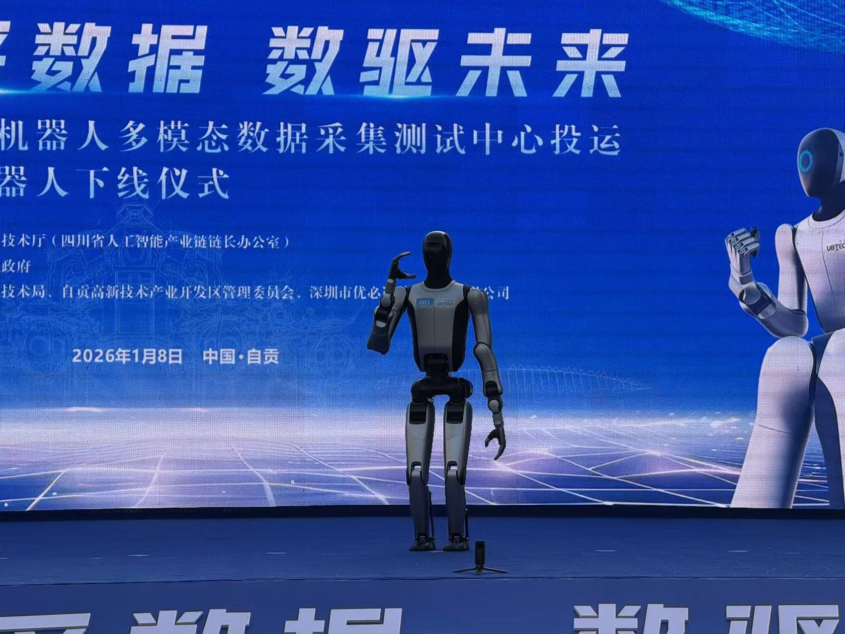 1月8日,在自贡机器人产业园,四川首个人形机器人多模态数据采集测试中心投运,编号001的人形机器人走上讲台,作为特别嘉宾发言。