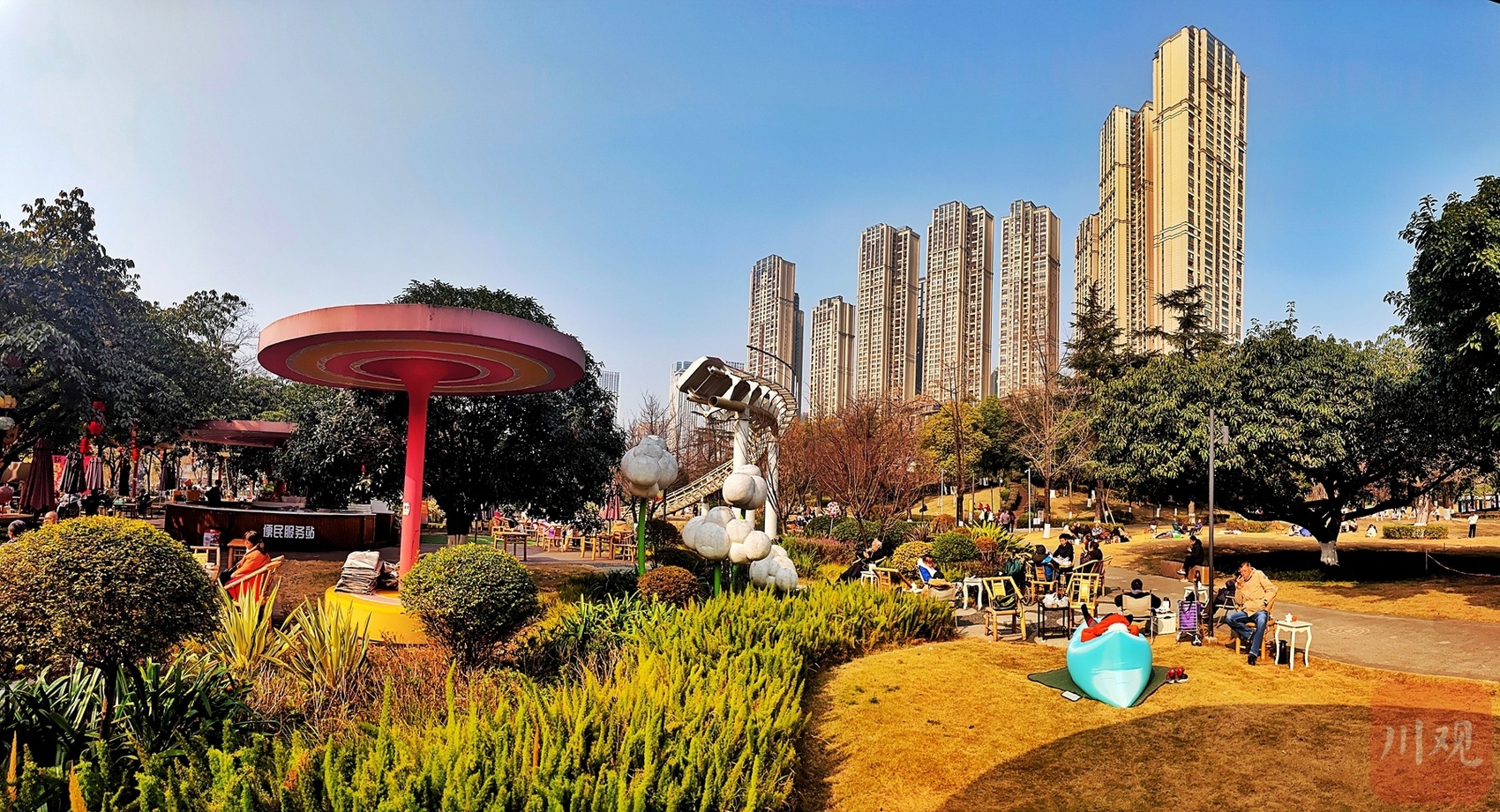 不远处的成华公园,则是另一番生活景象。草坪被冬日的阳光晒得暖洋洋的,市民们在地垫里或坐或卧,尽情享受着这难得的户外时光。有人带上了便携的小茶炉,现场煮起了茶,一边品尝美食,一边拍照打卡,记录下这美好的周末时光。