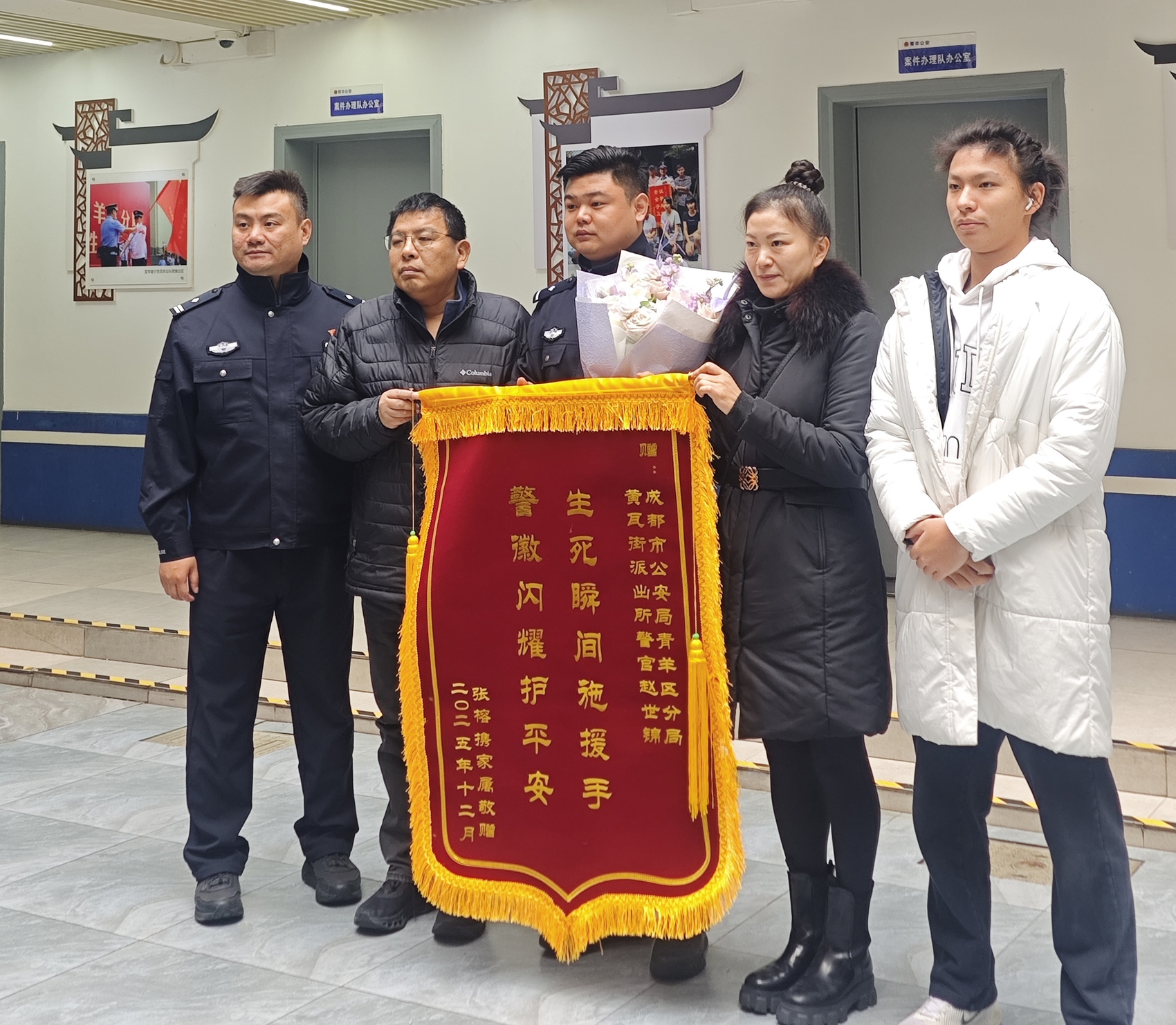 “生死瞬间施援手,警徽闪耀护平安”——这是2025年12月30日,成都市民张榕送给青羊区黄瓦街派出所民警赵世锦的锦旗。2025年12月2日晚7点,张榕在成都市双流区河池新居小区外的网球场突发心梗倒地,很快不省人事。此时,民警赵世锦路过此处,立刻上前查看其生命体征,并进行专业施救,最终把张榕从死亡边缘拉了回来。“是他给了我第二次生命。”张榕对赵世锦的救命之恩这辈子都不会忘。