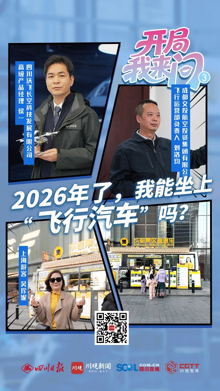 这是我第一次来四川旅游,除了逛逛成都市区,还想游览周边的九寨沟、乐山大佛、三星堆等景区,但坐车去最近的三星堆要一个多小时,去九寨沟更是要动车转大巴。听说四川在搞“飞行汽车”,要是能乘“飞行汽车”直达,该多快,体验该多好!我很关心下次再来四川,能圆这个“飞天梦”吗?