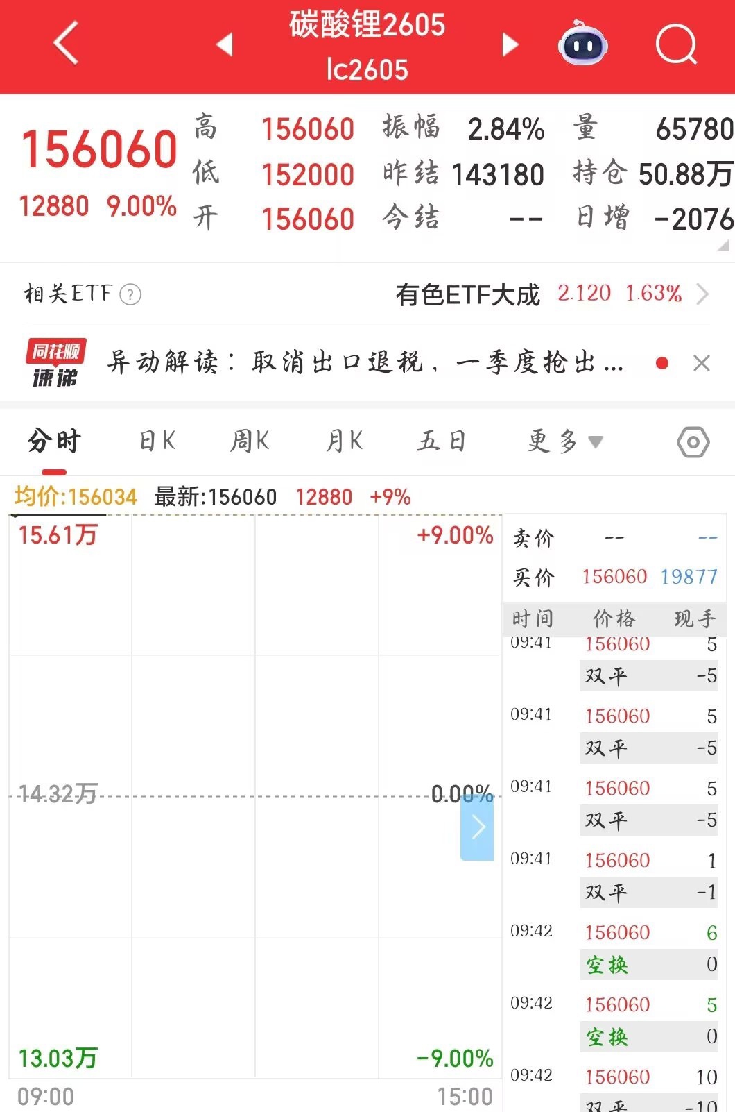 1月12日,国内商品期货市场开盘迎来强势表现,碳酸锂主力合约直接封死涨停,涨幅9%,报156060元/吨,两年来首次突破15万元关口。市场观点认为,这一行情与出口退税政策调整引发的下游抢装需求密切相关。