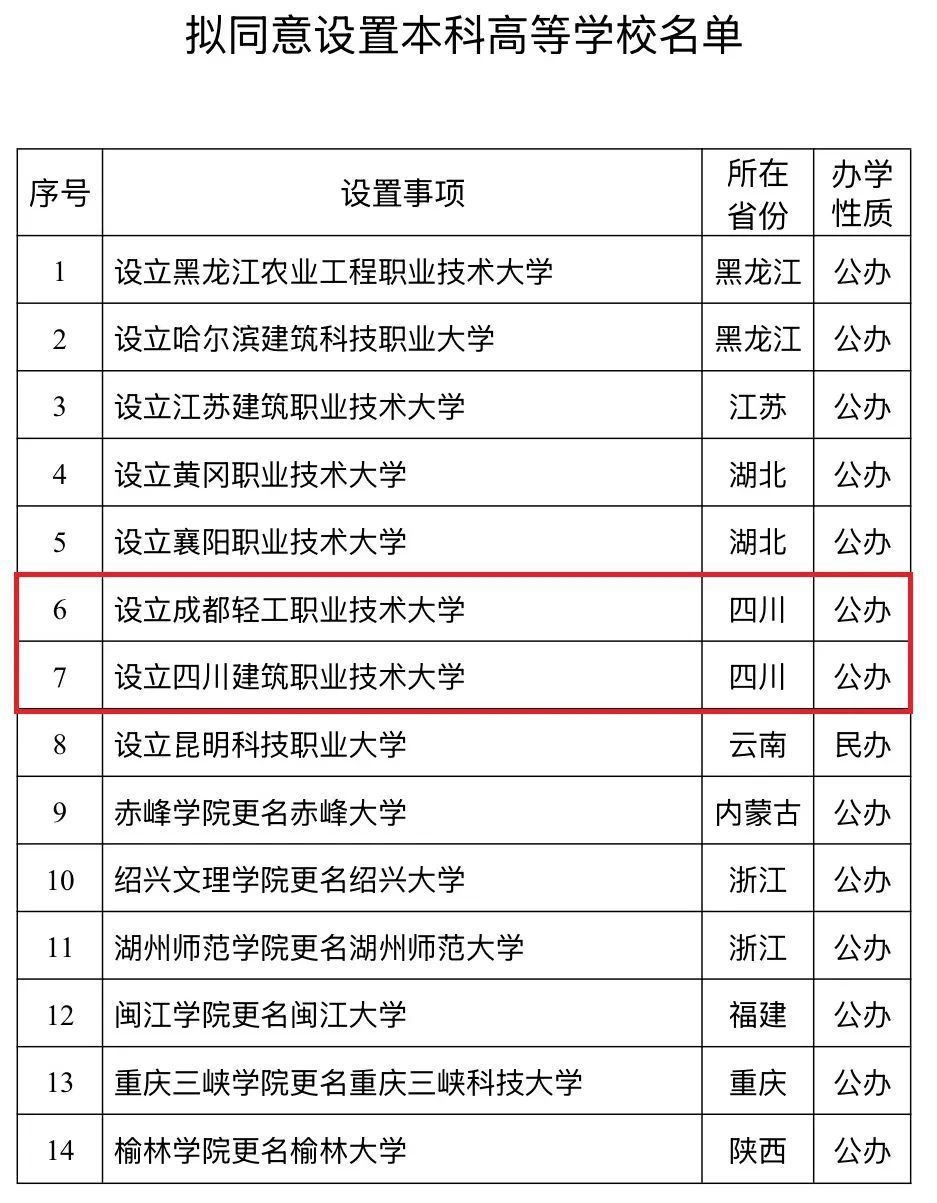 1月12日,教育部网站发布公示,教育部拟同意设置14所本科高等学校。其中,四川有2所,分别为成都轻工职业技术大学和四川建筑职业技术大学。