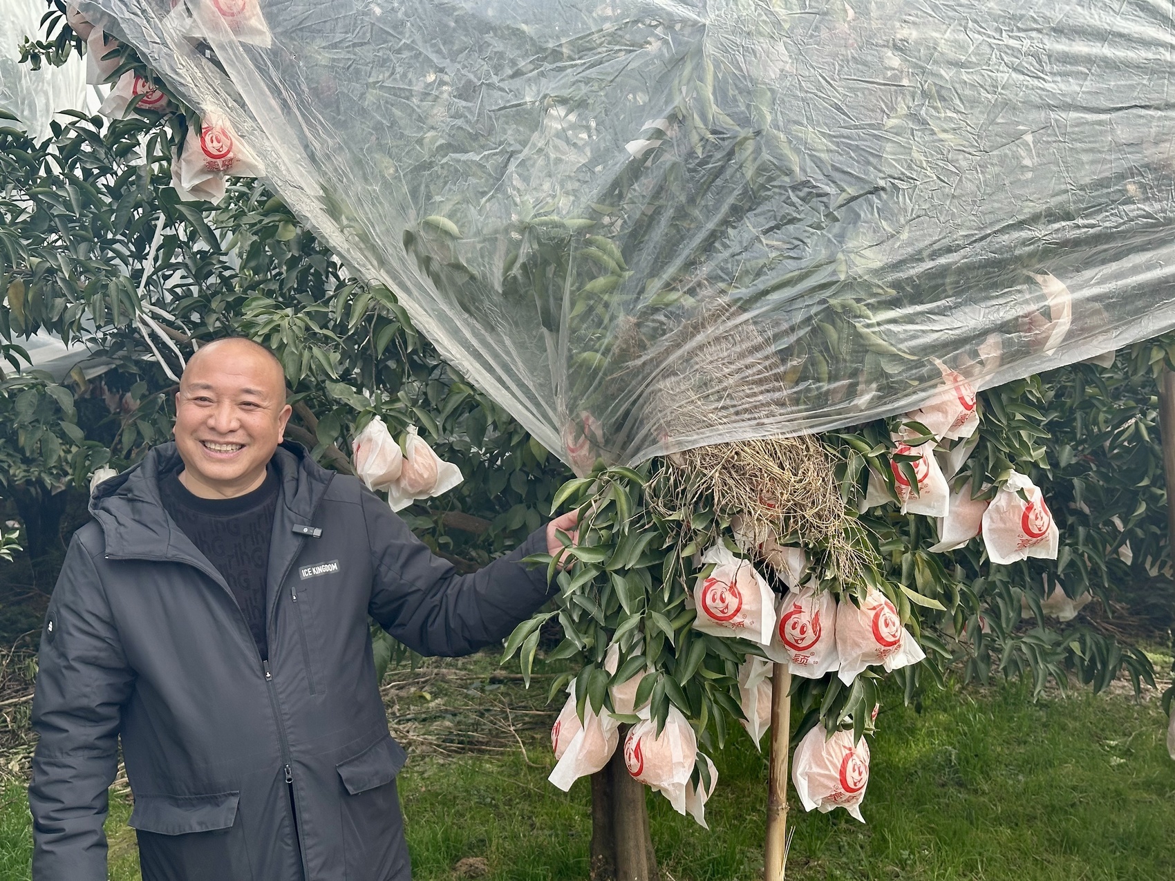 杨小林今年53岁,说话带着明显的方言腔,语速不快,始终笑呵呵的。他指着枝头套袋的果实说,现在最重要的不是忙着采,而是“等”。