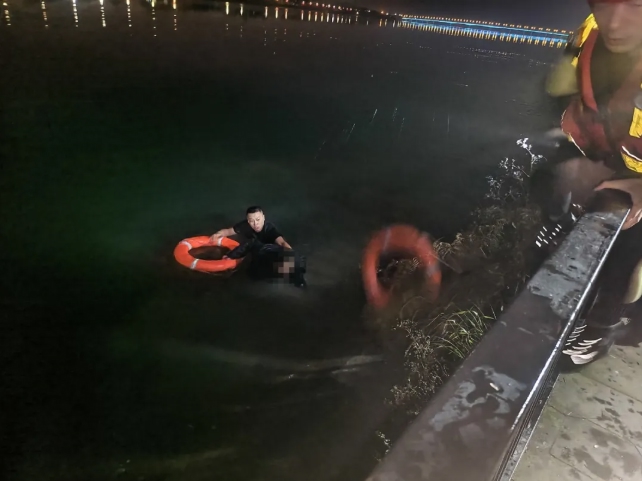 接警后,值班民警陈如贵立即联系消防部门,同时带领辅警彭鑫、李坤携带救生装备赶赴现场。到场后,三人迅速展开搜索,发现距岸边约二十米处有一名男子正仰面漂浮着。该男子虽意识清醒、仍在呼救,但声音已十分微弱。