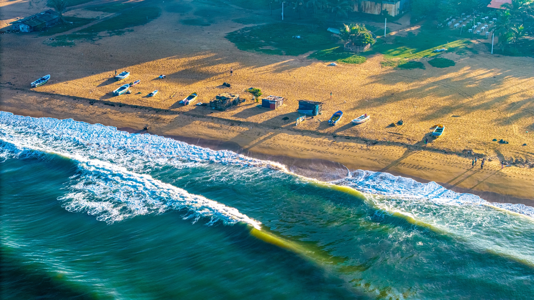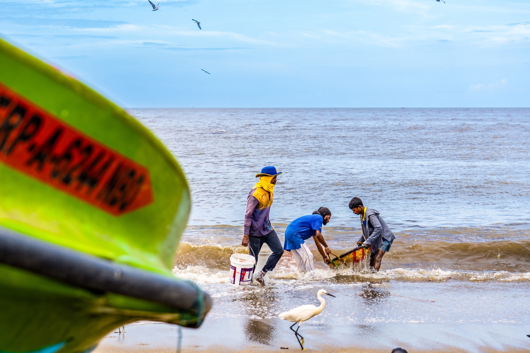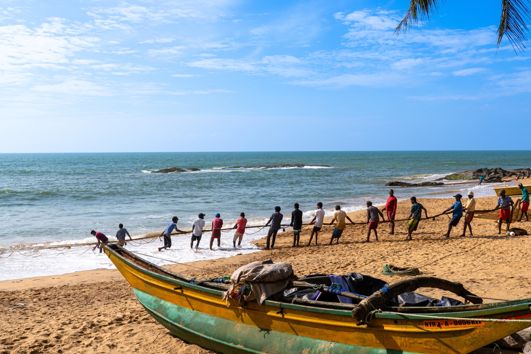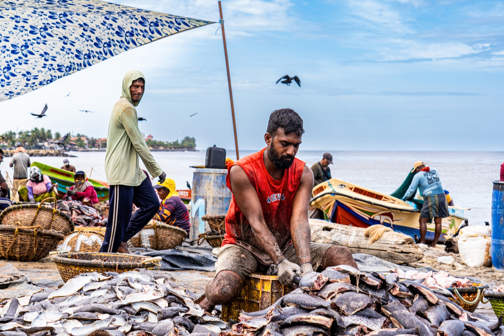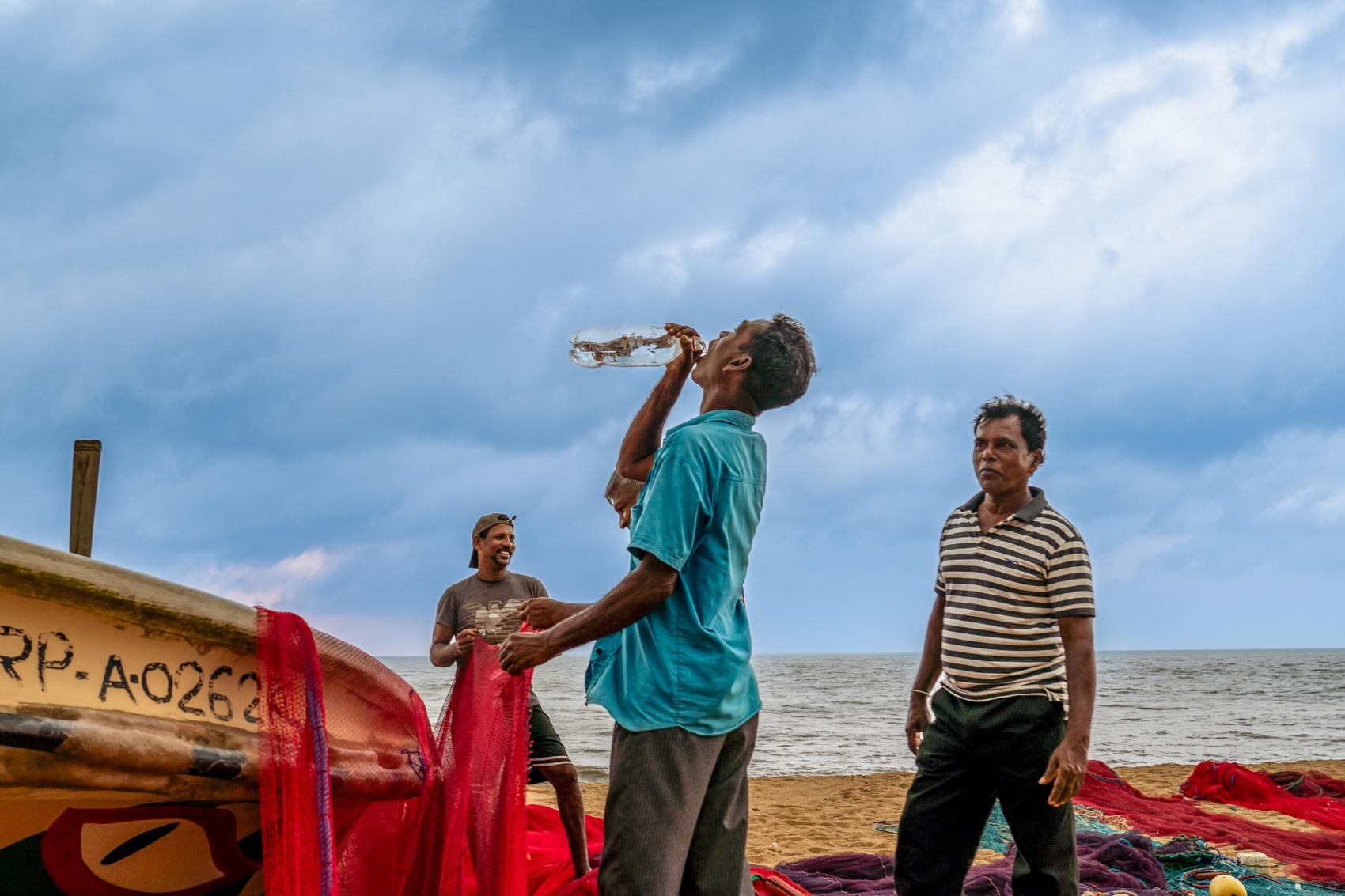 我们的旅程始于尼甘布鱼市,清晨的第一缕阳光洒在满载而归的渔船上,空气中弥漫着咸湿与鱼腥,渔夫们忙碌的身影与堆积如山的渔获,构成了最鲜活的 “人间烟火”。随后,我们追摄汉班托塔的澄澈海岸,在蓝天碧水间感受大自然的纯净呼吸;在贝鲁湾,我们定格了传统拉网捕鱼的震撼场景,几十名渔民喊着号子齐心协力,那是原始劳作与团结协作的最美韵律。