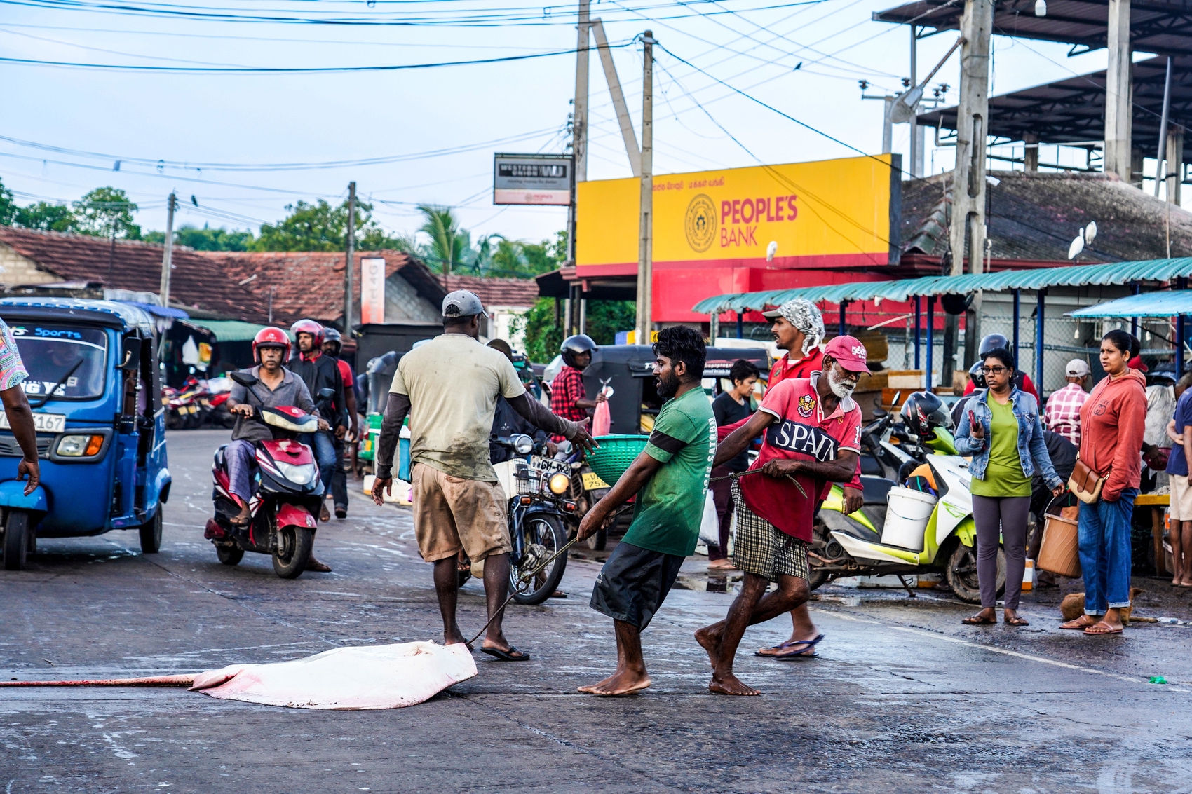 尼甘布鱼市,渔民拖着巨大的黄貂鱼穿过柏油路。