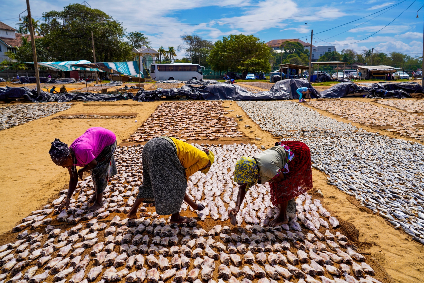 尼甘布晒鱼场,几位妇女头顶烈日躬身劳作,翻晒着铺在地面的鱼干。