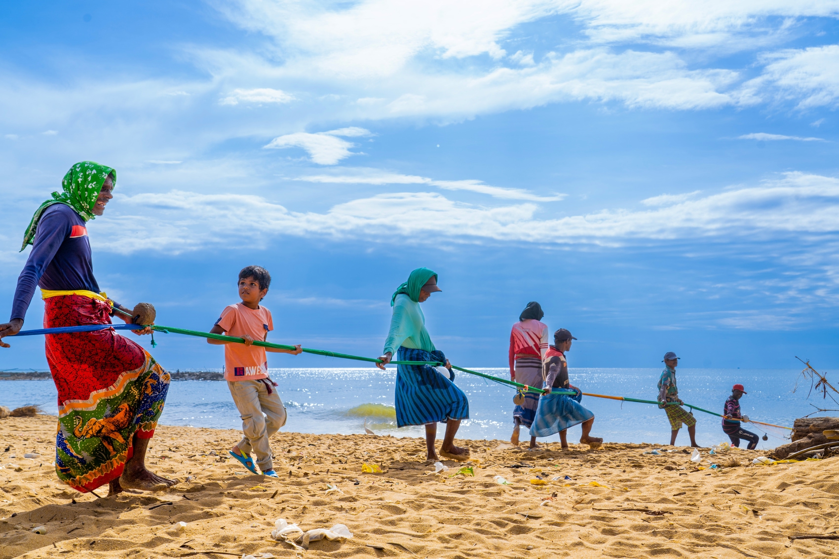 斯里兰卡贝鲁湾沙滩上,渔民们与孩童在沙滩上排成一列,齐心协力拉动巨大的渔网。
