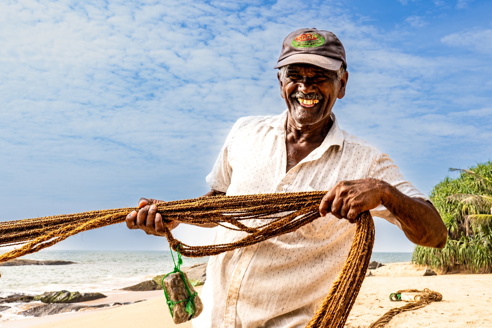 斯里兰卡贝鲁湾,沙滩上拉网的老人向游客微笑致意。