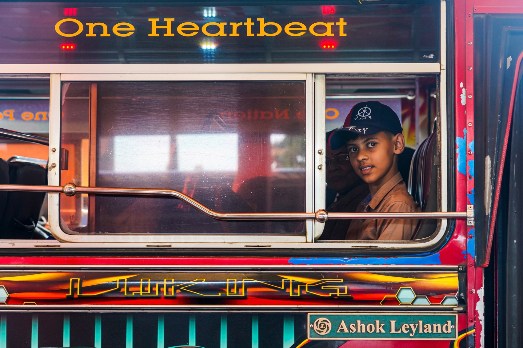 马塔拉汽车站,色彩斑斓的巴士窗边,一位少年的纯真微笑格外耀眼。