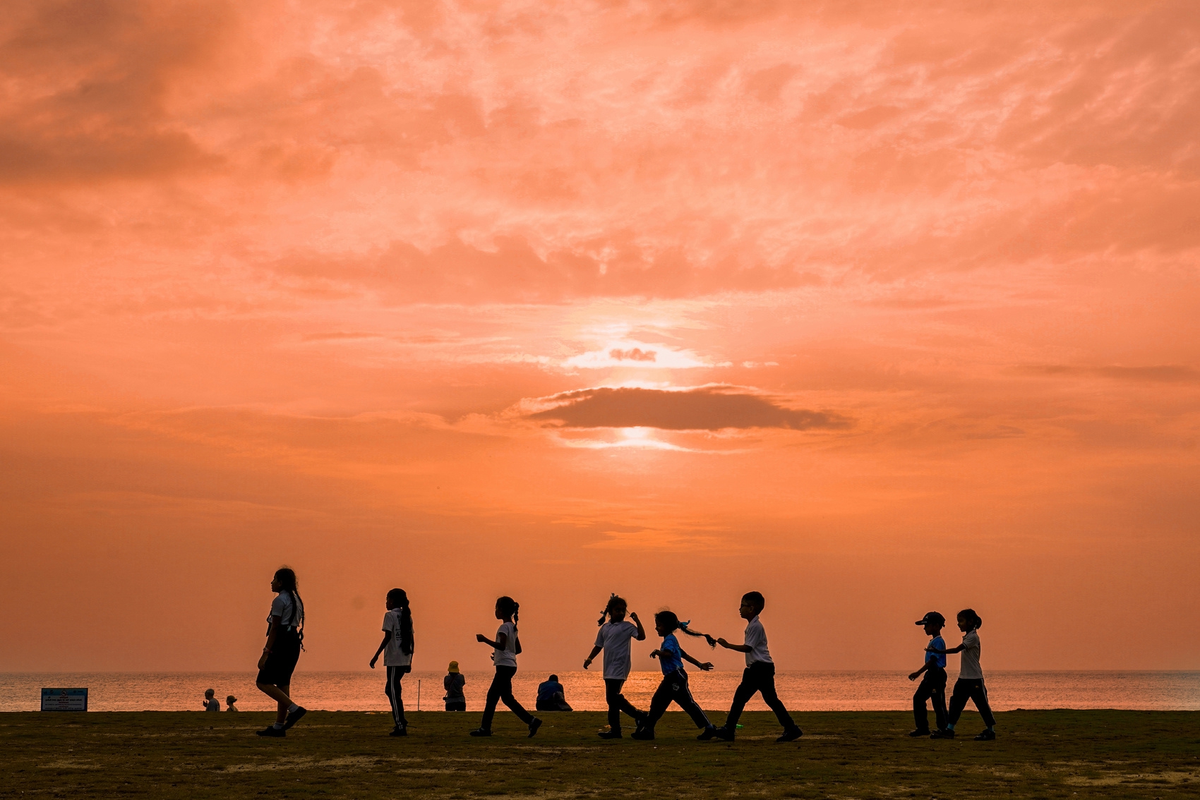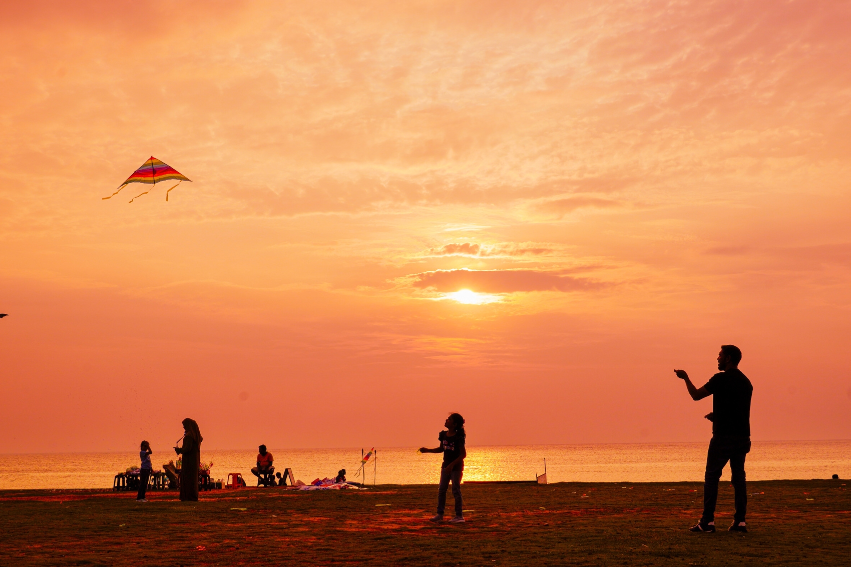 斯里兰卡科伦坡,夕阳下的加勒菲斯绿地广场,市民带着孩子在沙滩上放风筝。