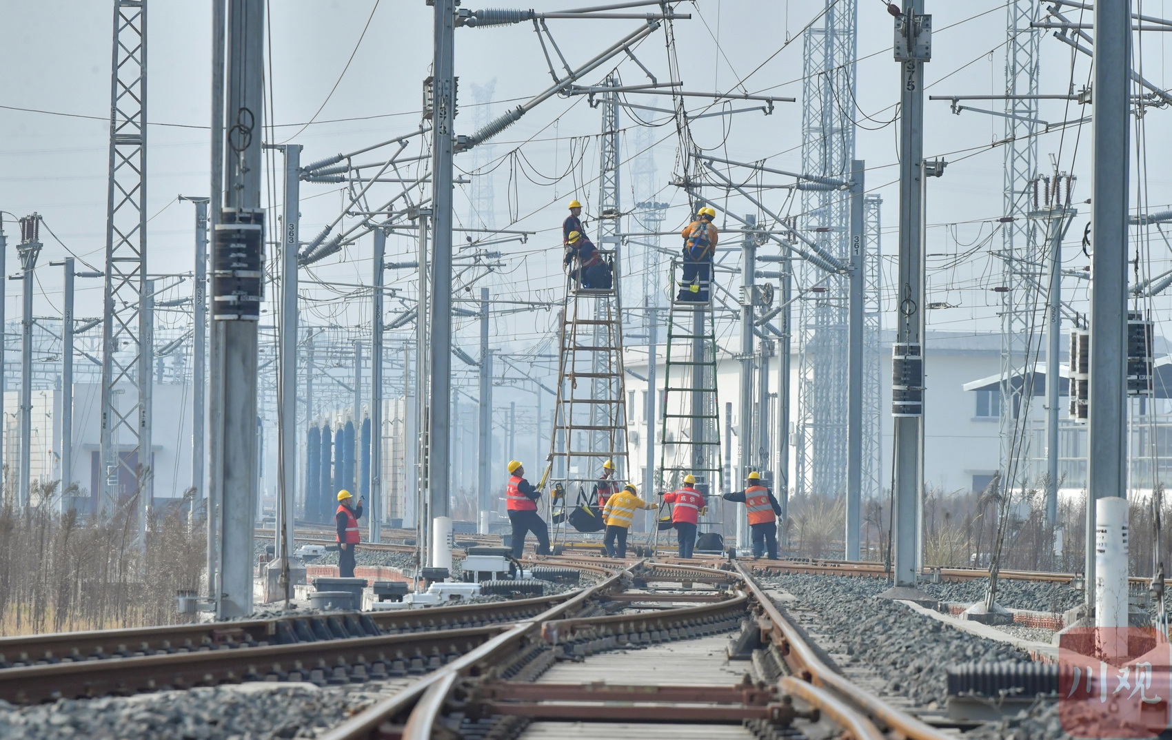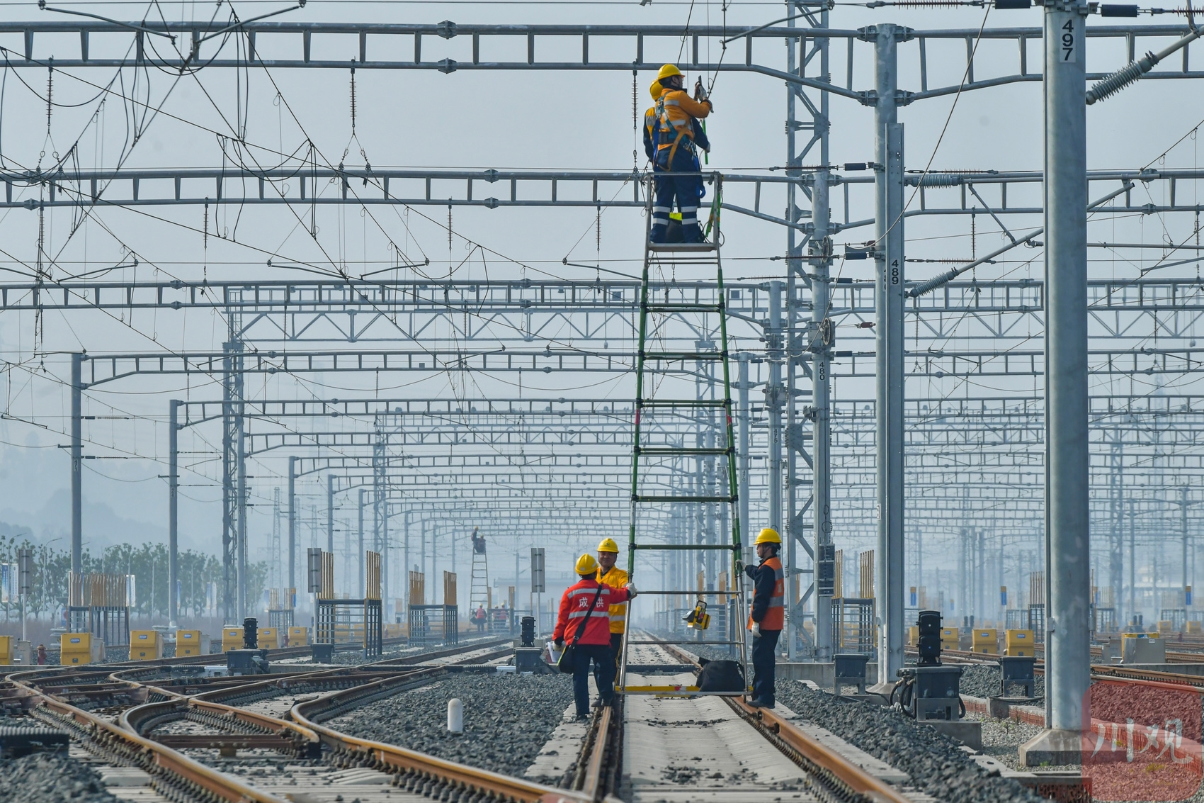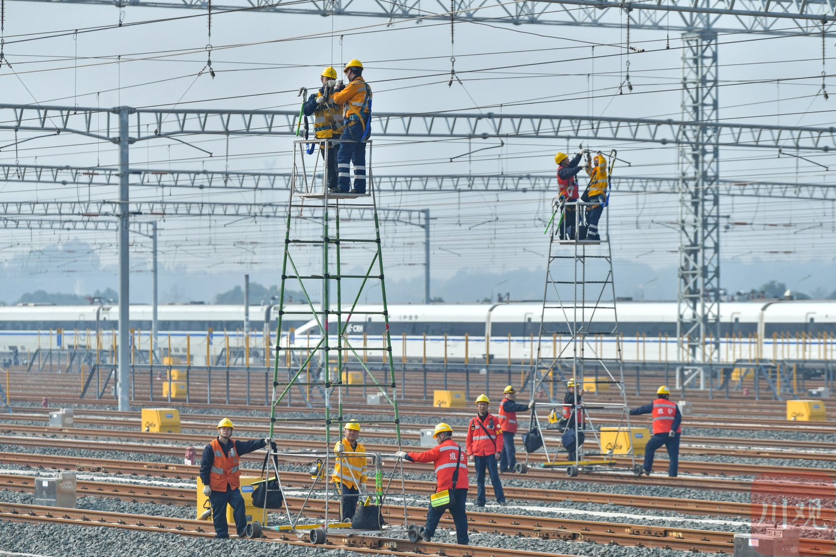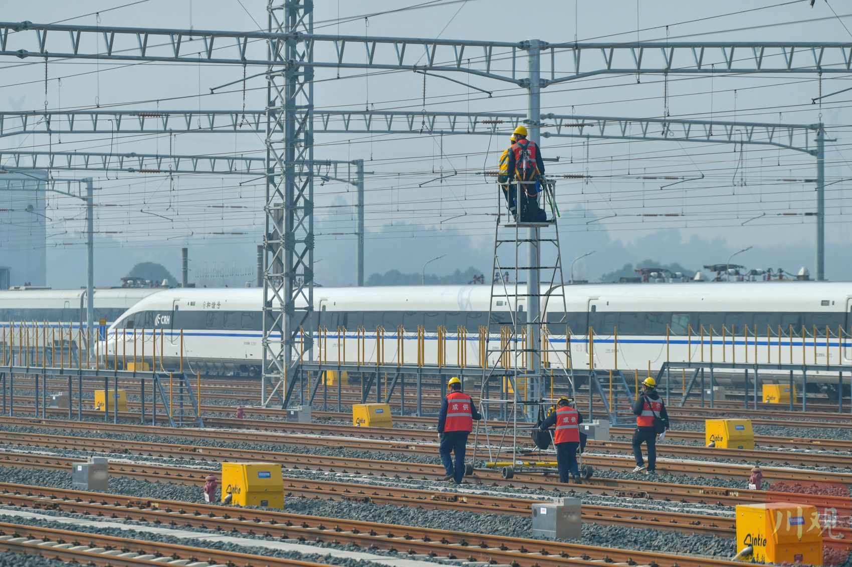 1月13日,中国铁路成都局集团有限公司成都供电段组织职工在天府动车所开展接触网设备集中检修,全力确保供电设备运行稳定。