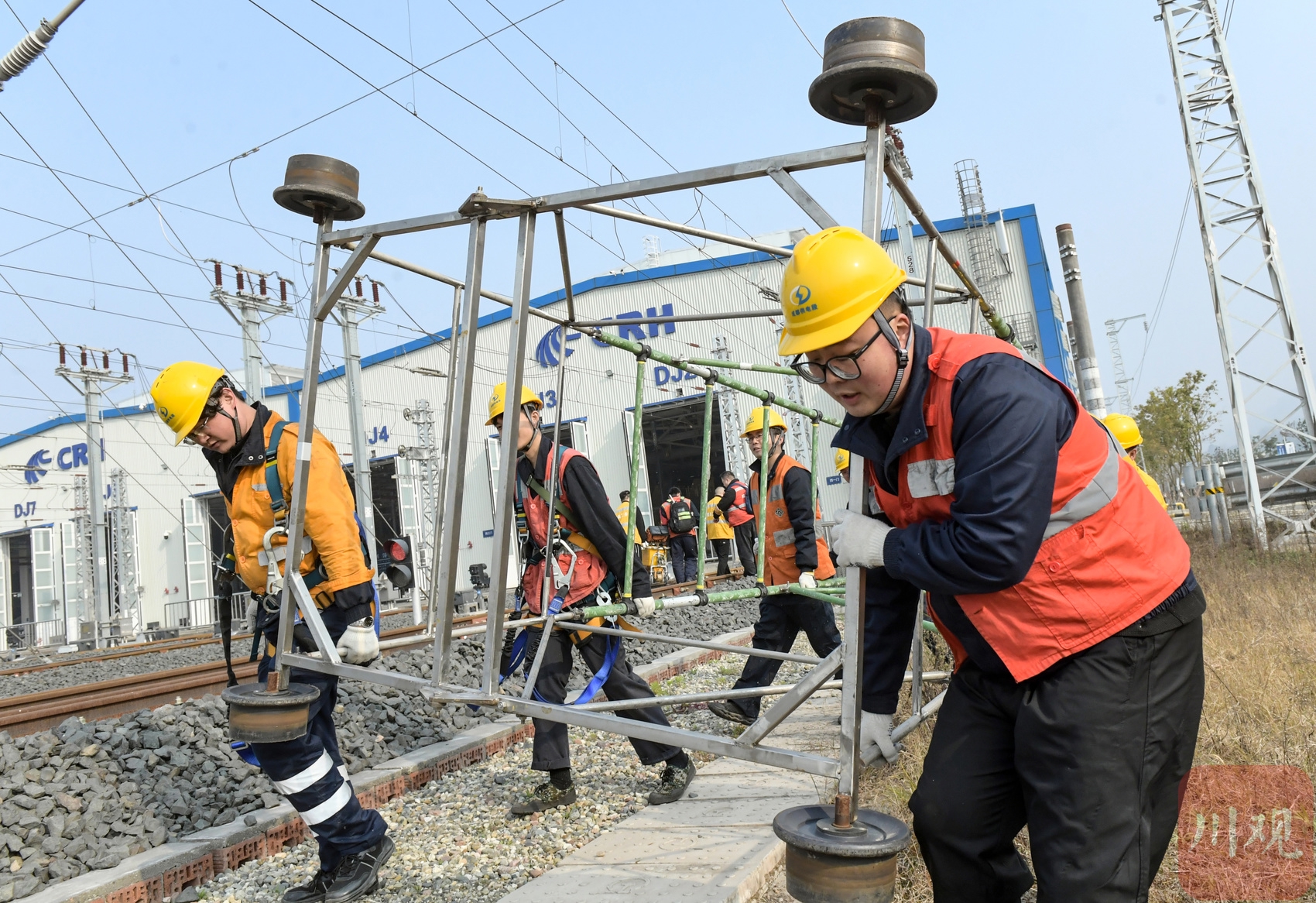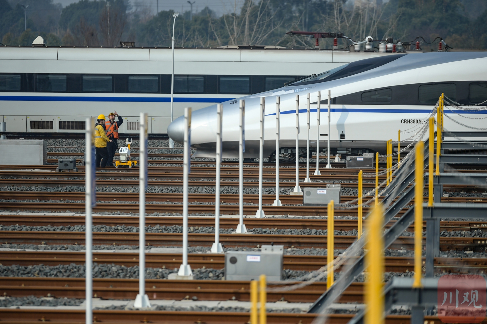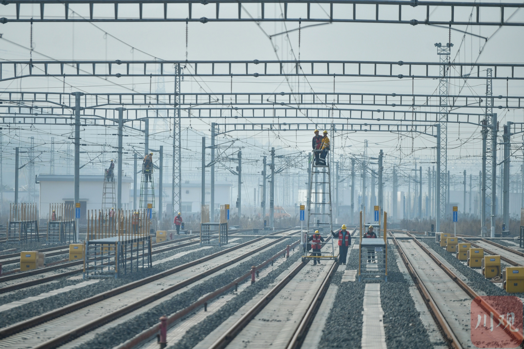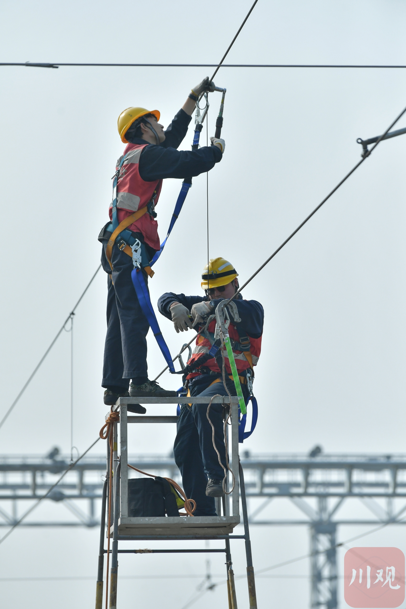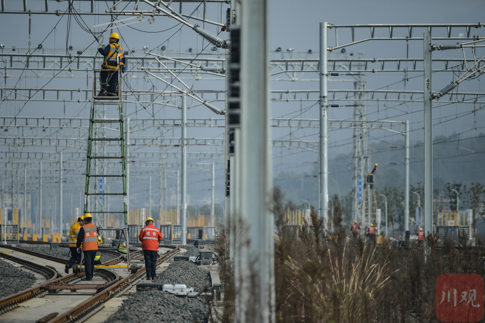 1月13日,中国铁路成都局集团有限公司成都供电段组织职工在天府动车所开展接触网设备集中检修,全力确保供电设备运行稳定。
