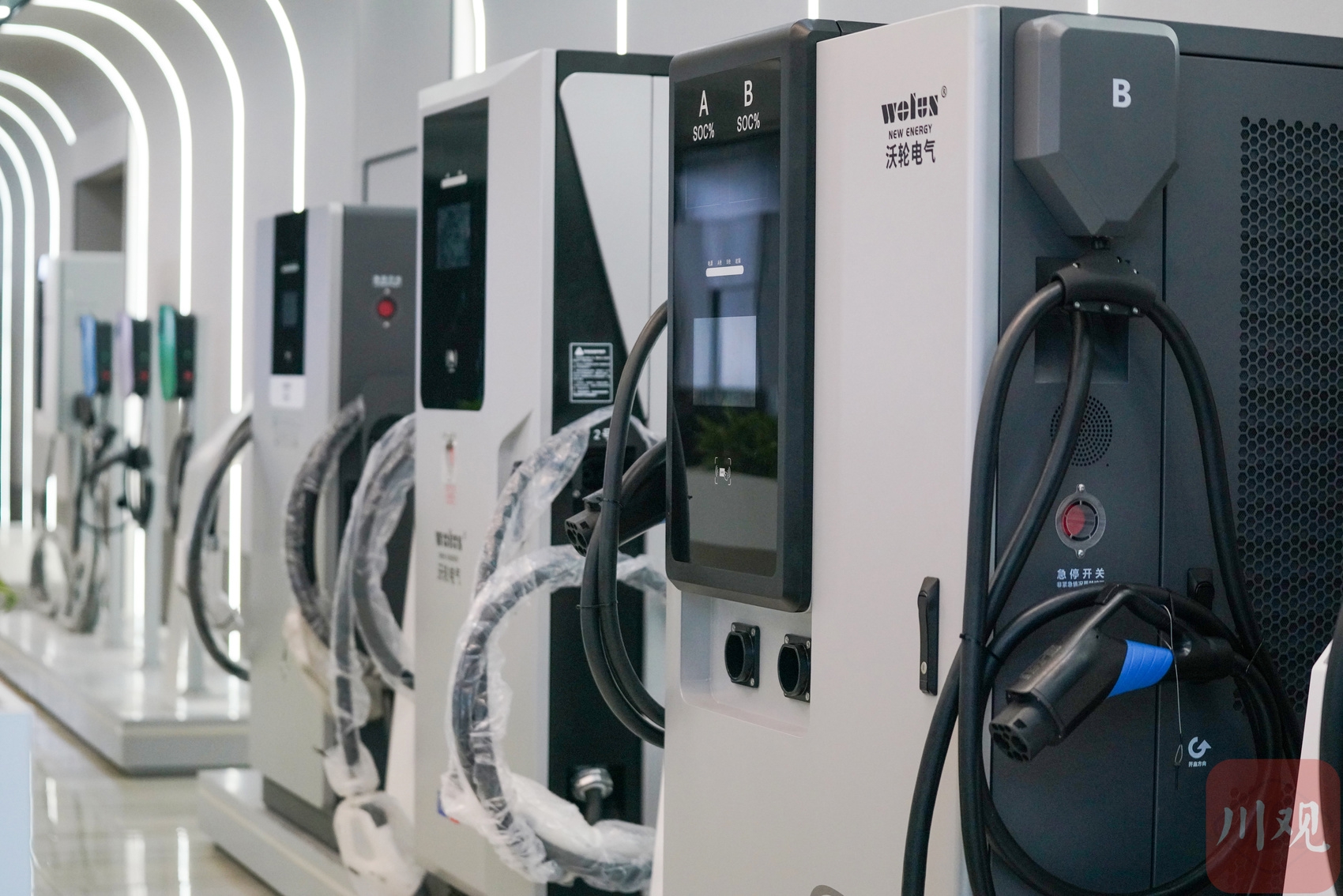 沃轮电气成都总部展陈区域,最近刚换上了公司最新一批上市的新能源充电桩设备,其中不少已经顺利出口到了欧洲、东南亚和中亚等海外市场,里面还有几款海外定制款。