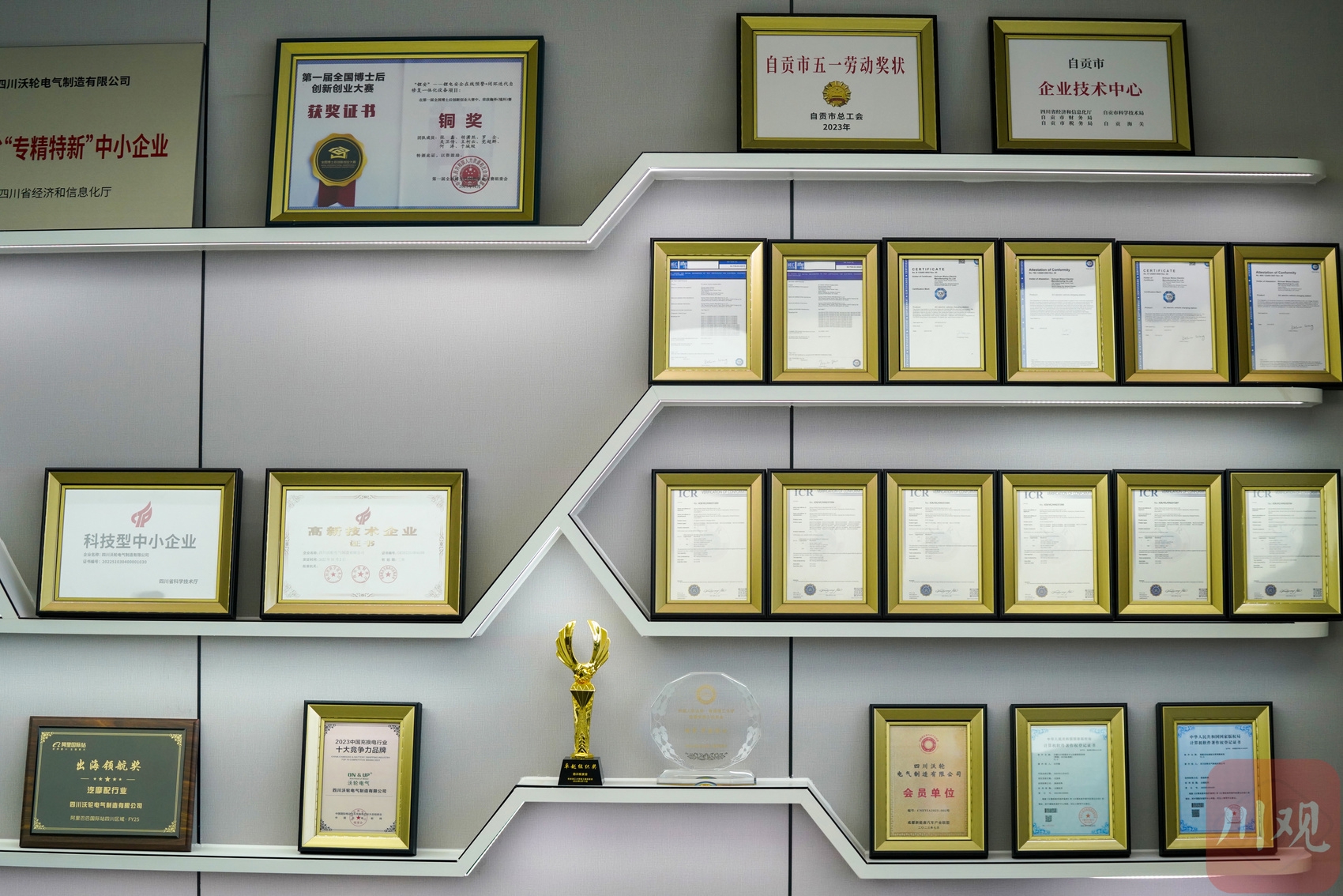 四川沃轮电气制造有限公司展示墙上,摆满了出口认证证书(吴聃摄)