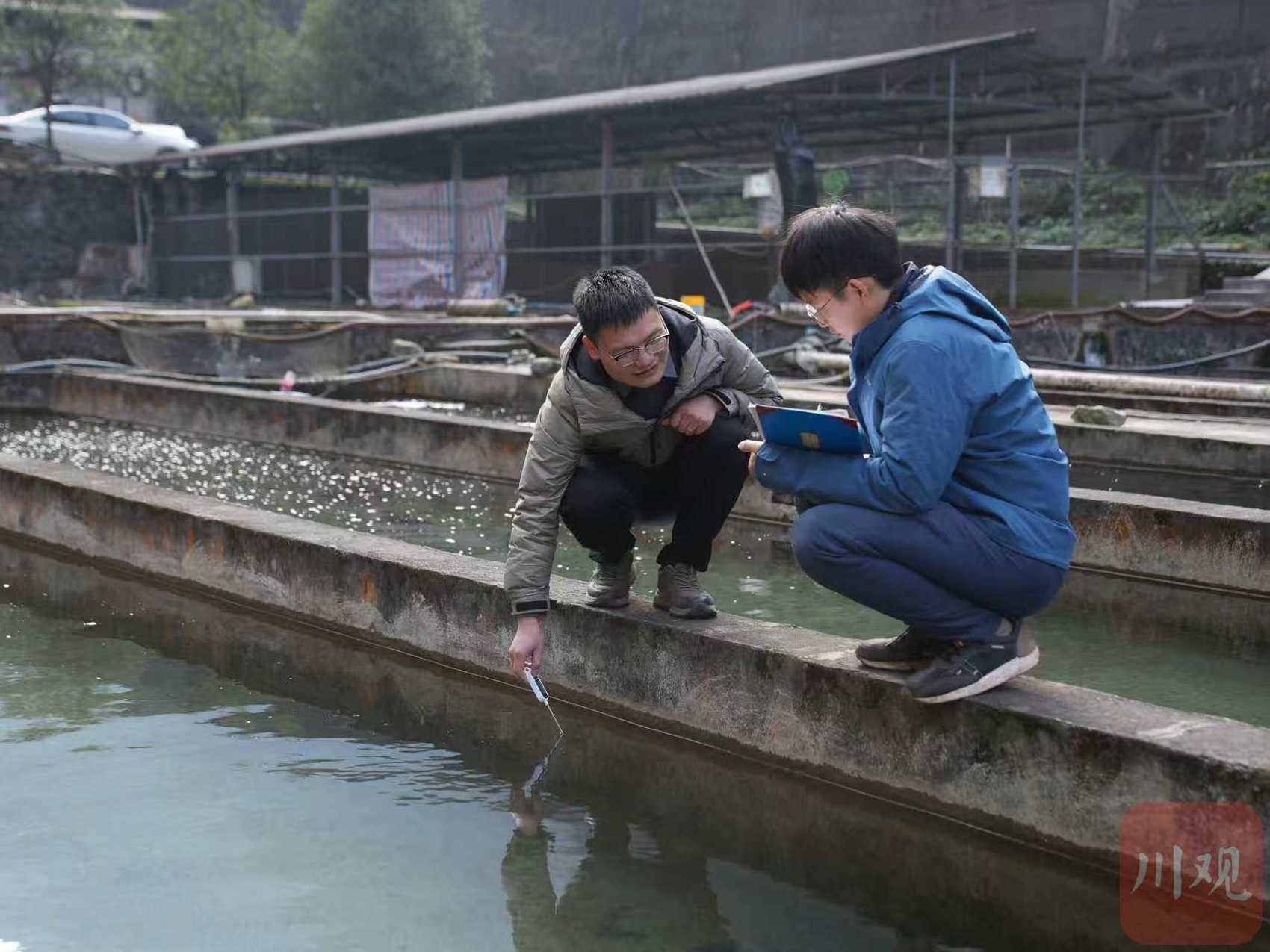 杨焕超(左)和同事在测量记录鱼池水温。