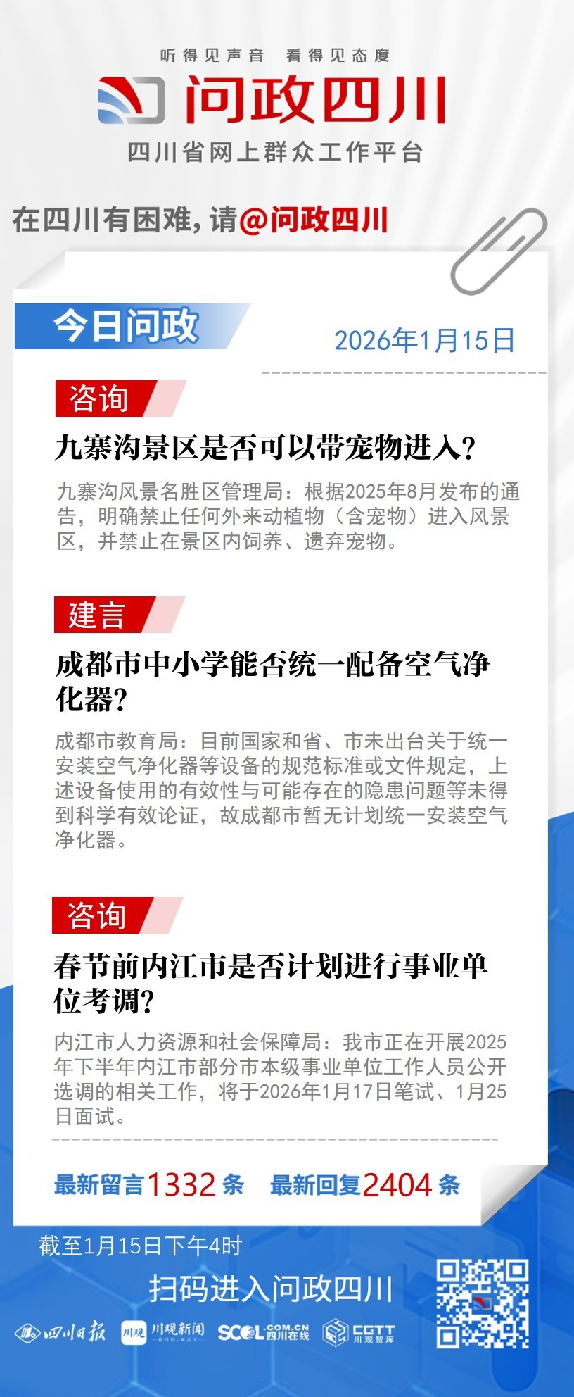 在四川有困难,找问政四川。如果您在四川遇到了操心事、烦心事、揪心事,请登录“四川省网上群众工作平台—问政四川”或拨打问政四川热线(028-96001)留言反映、求助或建议。我们将充分发挥平台的互动联系作用及舆论监督功能,第一时间传递民声,推动问题得以及时解决——听得见声音,看得见态度。
