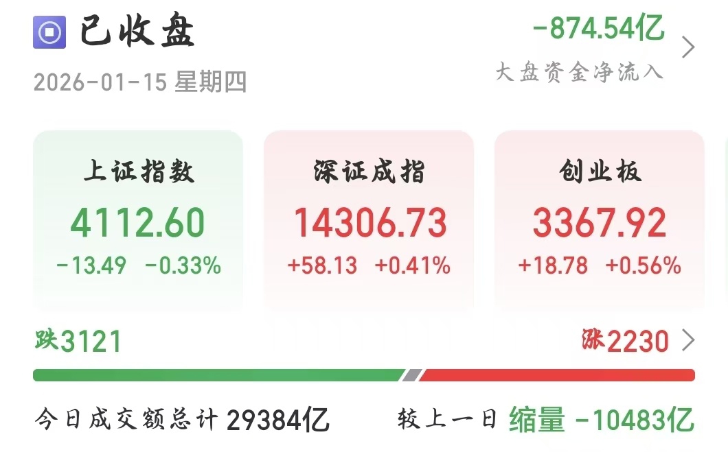 1月15日,A股上演“跷跷板”行情,主要指数分化。截至收盘,上证指数收跌0.33%报4112.6点;深证成指涨0.41%报14306.73点;创业板指涨0.56%报3367.92点。全天成交2.94万亿元,较上日大幅缩减超1万亿元。上涨个股数超2200只。