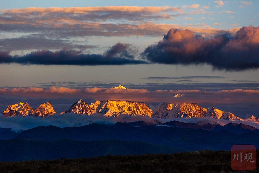康定市鱼子西眺望贡嘎雪山,夕阳西下,皑皑雪峰被绚丽的晚霞染红。