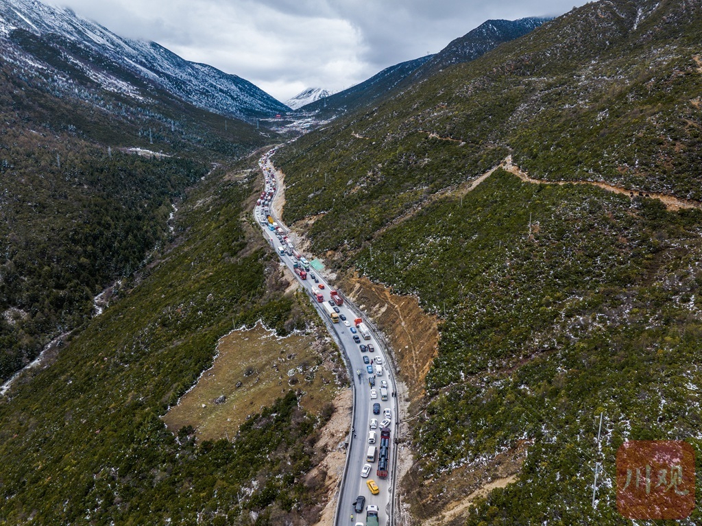 节日期间的康定市折多山,自驾进州的旅游车队排起长龙,一眼望不到头。