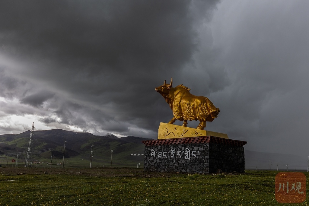 理塘毛垭大草原,一尊牦牛铜像屹立天地间。