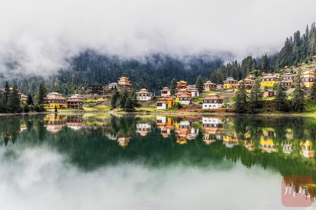 新龙县措卡湖云雾轻笼,湖面映出云天倒影。