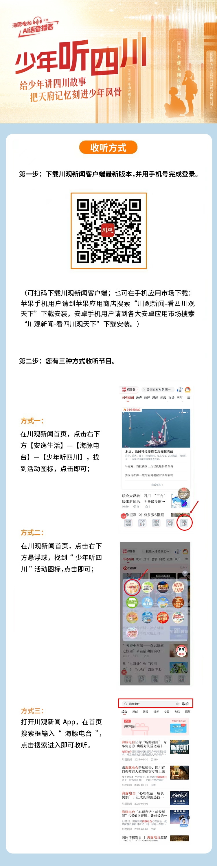 川观新闻海豚电台全新AI语音播客栏目《少年听四川》今日正式上线。不让历史躺在书本里,不让地理停在课件上,我们用声音带你穿越历史跨越山河,让四川的故事,主动走进你的耳朵里。该播客产品专为中小学生及家长设计,既可作为课堂学习的延伸,也能作为家庭共听的文化时光。一课一得,润物无声。