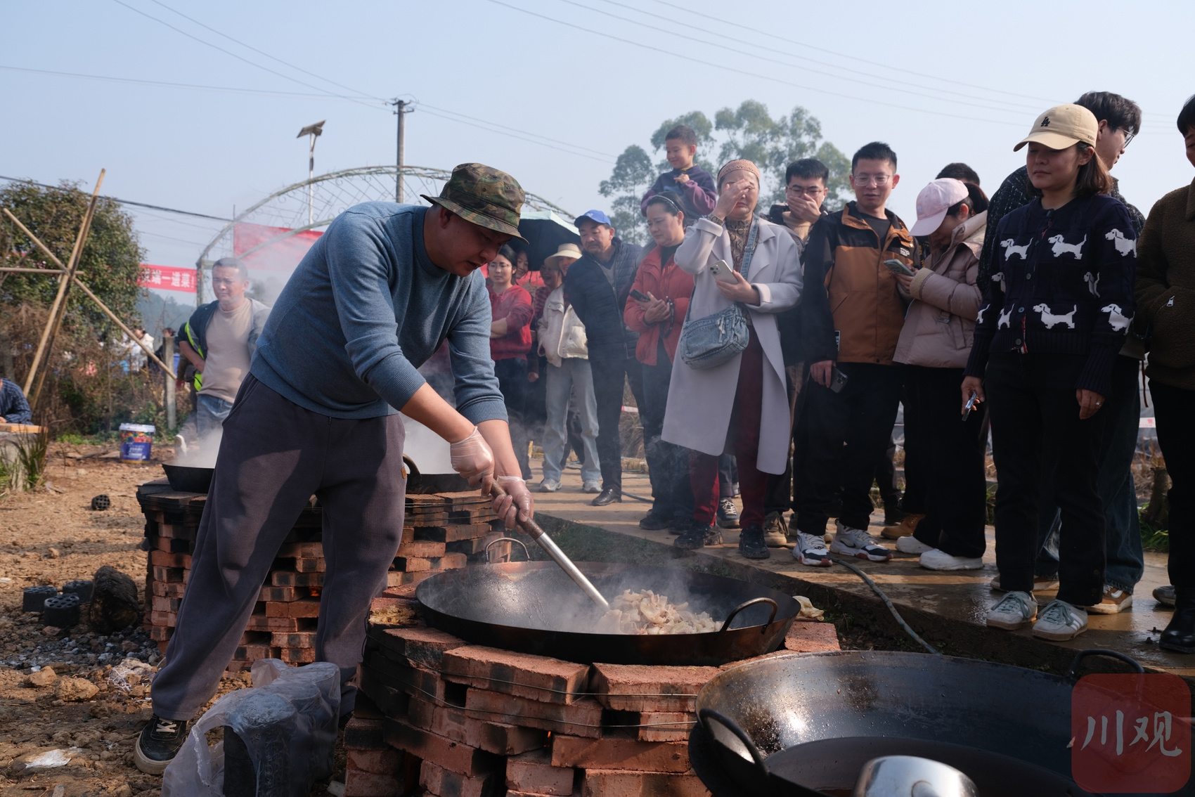 随着猪肉陆续处理完毕,大铁锅中的汤水翻滚蒸腾,香气扑鼻。酥肉在油锅里嗞嗞作响,回锅肉浓香四溢,炖猪蹄热气袅袅,肝腰合炒色泽油亮。有人翻炒时忆起儿时村里的杀猪宴,也有人领着孩子蹲在一旁,讲解“这就是过去的年味”。每一道工序都有网友参与:切菜、洗菜、掌勺、备料,每个人都在用行动贡献着一份力量。阳光洒在灶台,蒸汽缭绕,炊烟袅袅,整片场地笼罩在忙碌而温暖的氛围之中。