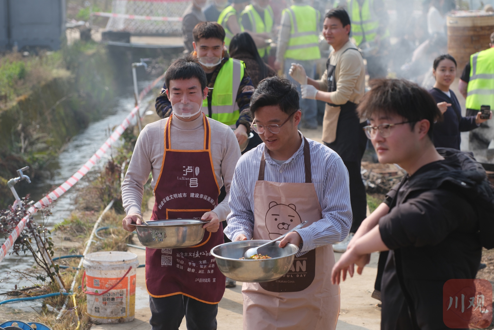 老人们守在灶台边,一边指点年轻人忙碌,一边不时俯身叮嘱注意安全。年轻人则分工有序,搬柴、运菜、洗切、备料,人人手脚不停,场面忙碌却井然有序。