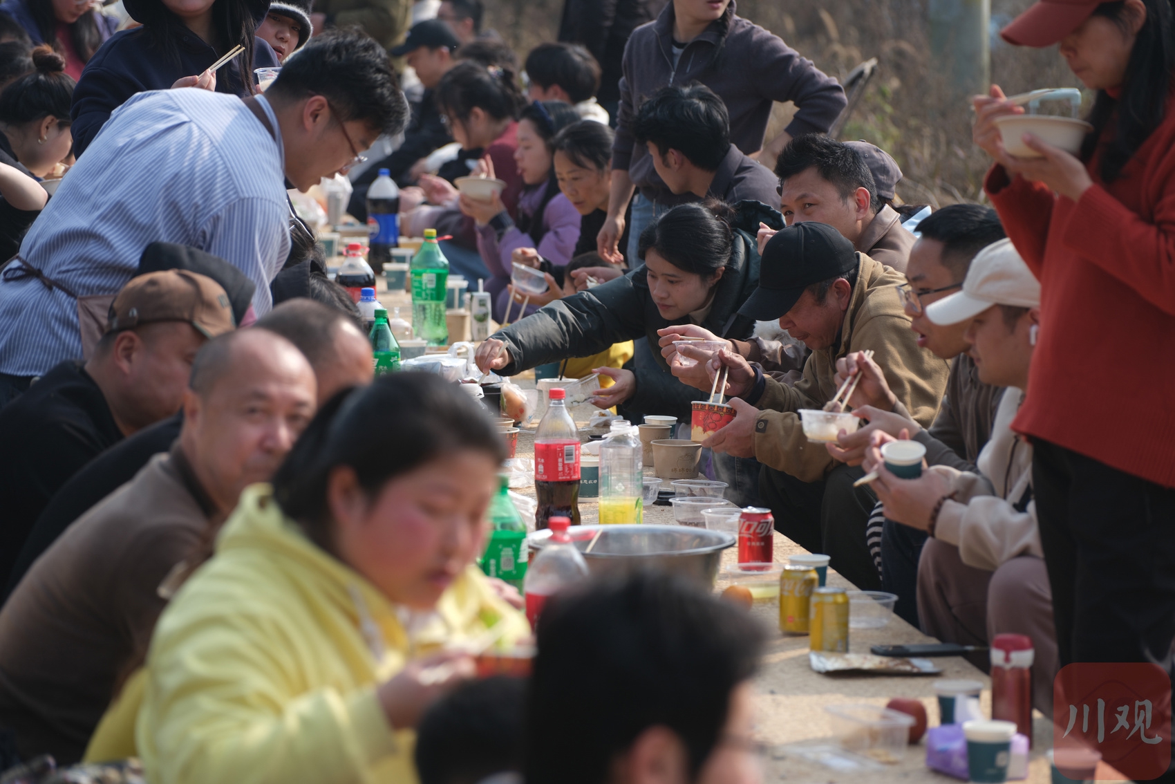 桌椅沿田间小道依次排开,人们端碗排队,陆续入座。锅气、人声、笑语交织升腾,热闹中流淌着温情。年轻人主动搀扶老人、传递碗筷,孩子们在空地上欢快奔跑,老人们围坐笑谈,整个场面洋溢着浓郁的生活气息与邻里暖意。
