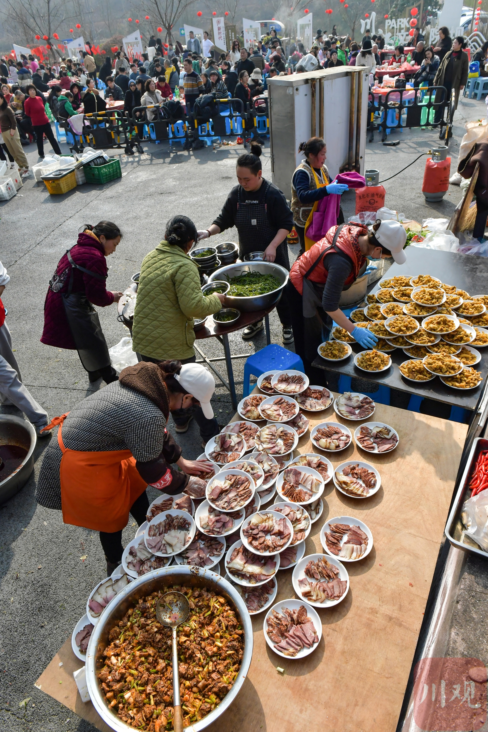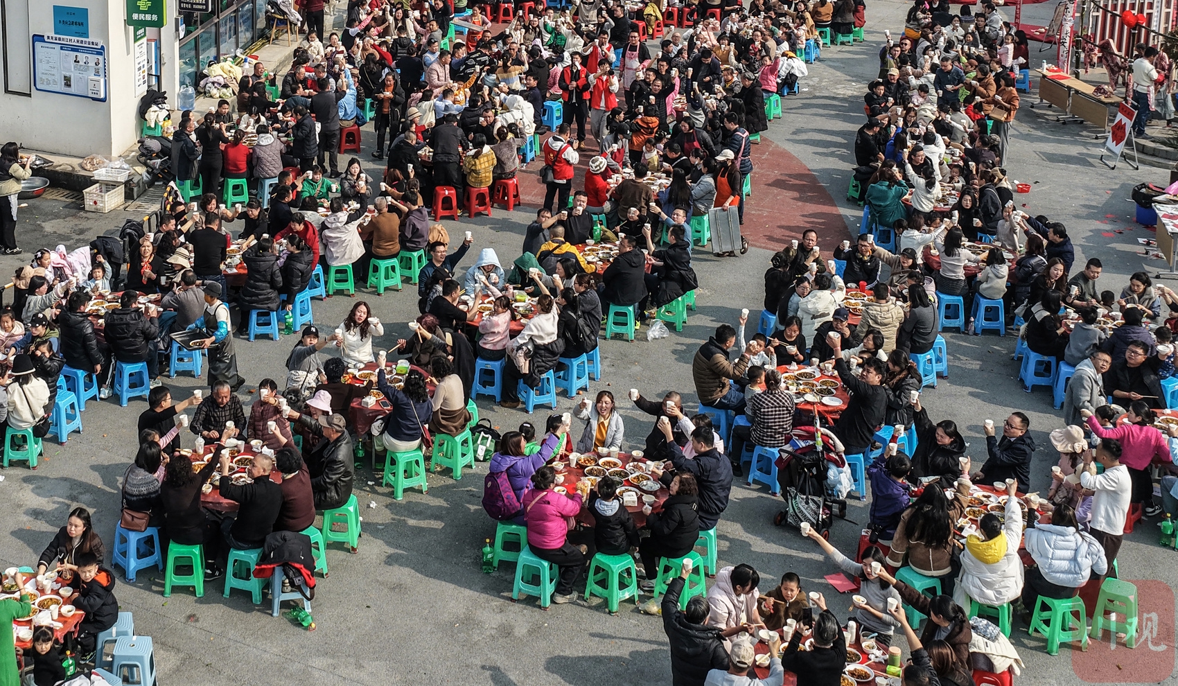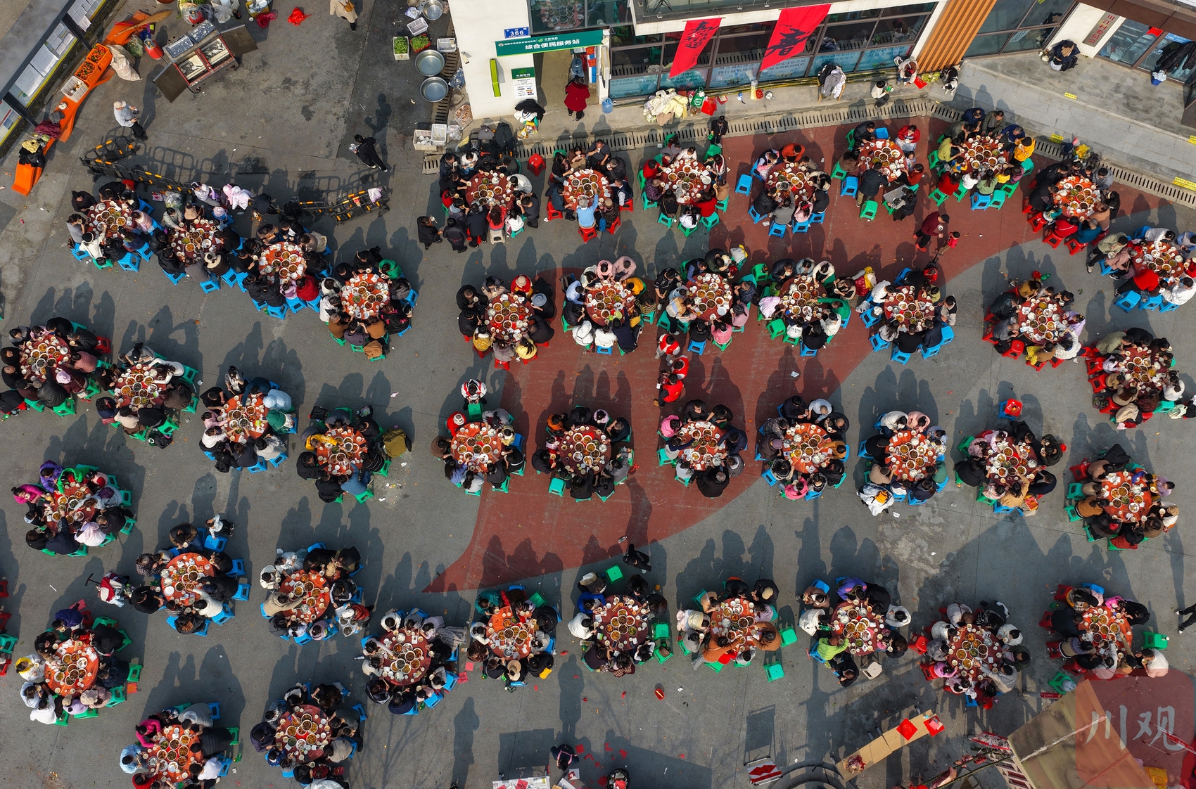 1月17日,四川省成都市双流区黄龙溪镇川江村内,40余桌坝坝宴整齐排开。村民与游客欢聚一堂,参与趣味活动,共享坝坝宴,在热气蒸腾中共品年味,喜迎新春。