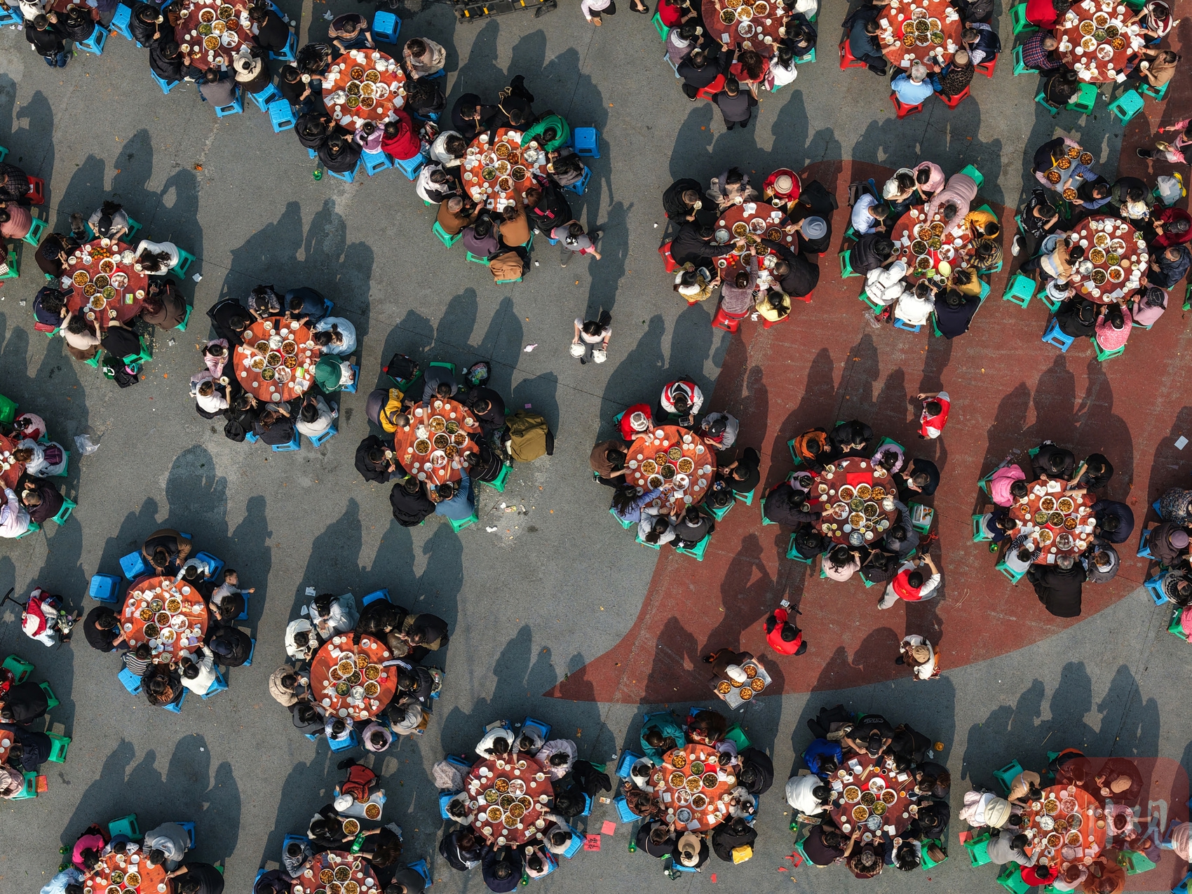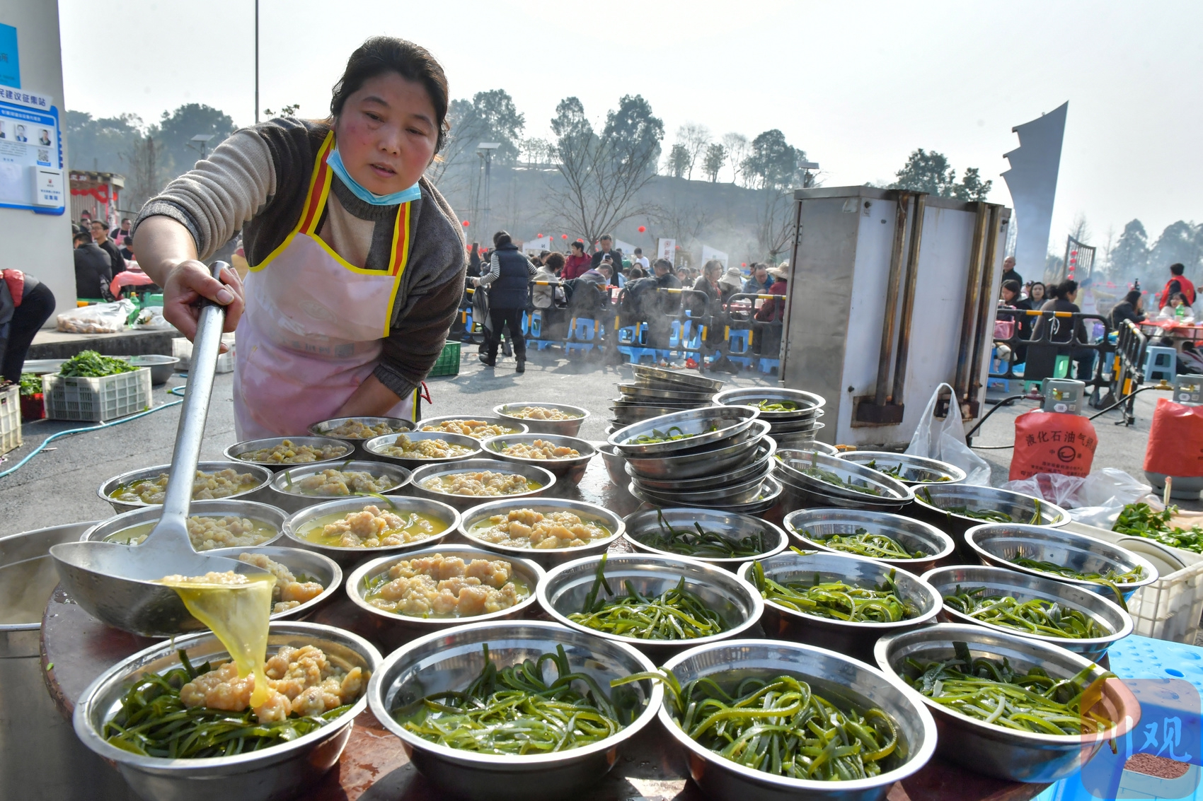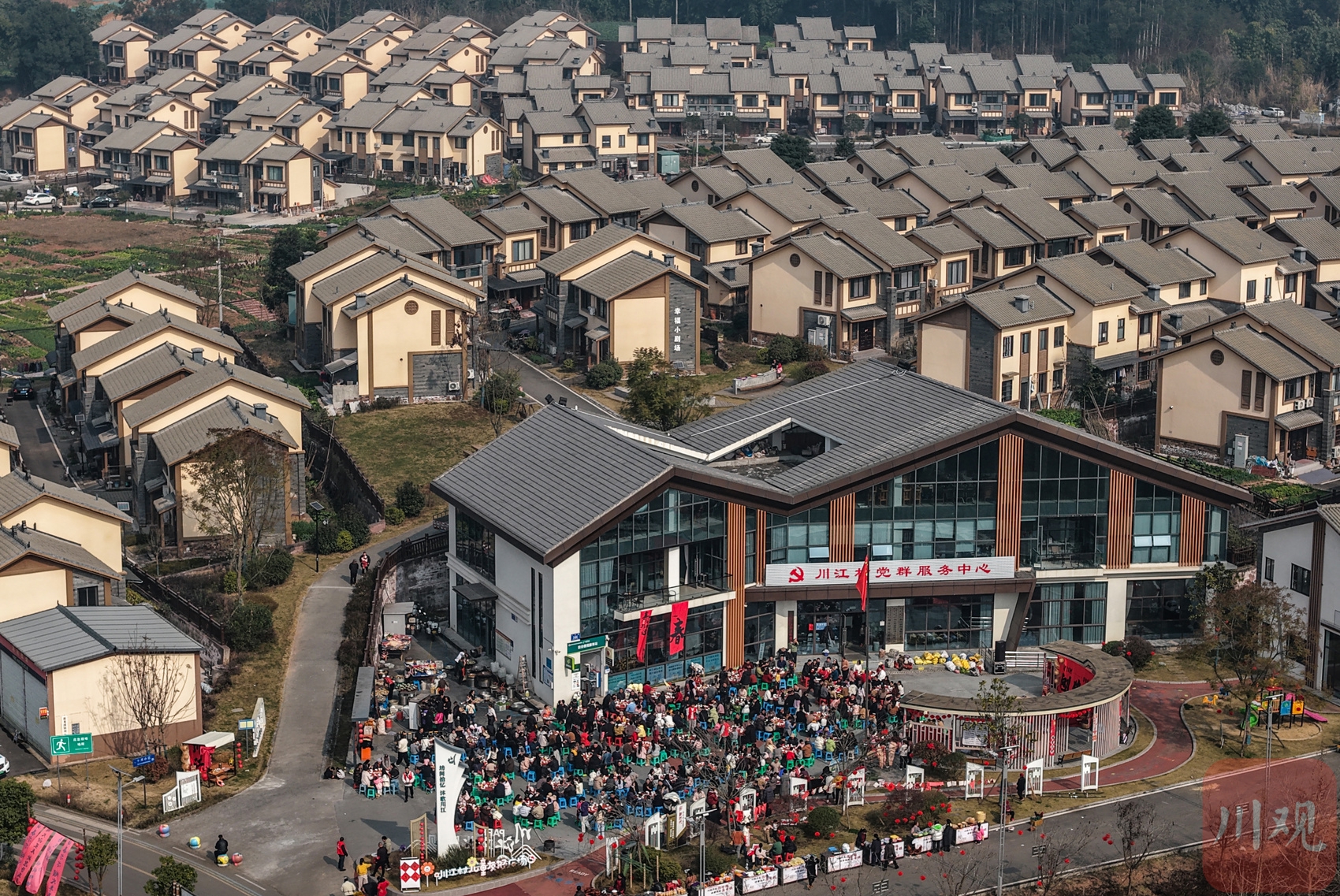 1月17日,四川省成都市双流区黄龙溪镇川江村内,40余桌坝坝宴整齐排开。村民与游客欢聚一堂,参与趣味活动,共享坝坝宴,在热气蒸腾中共品年味,喜迎新春。